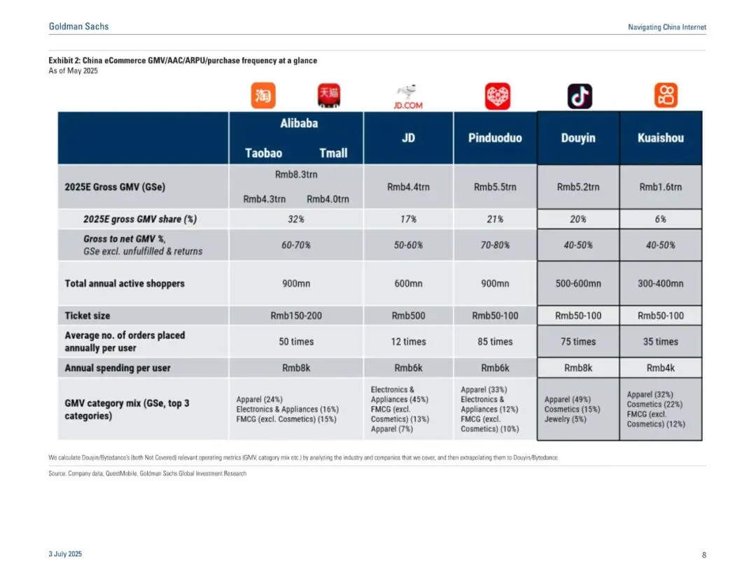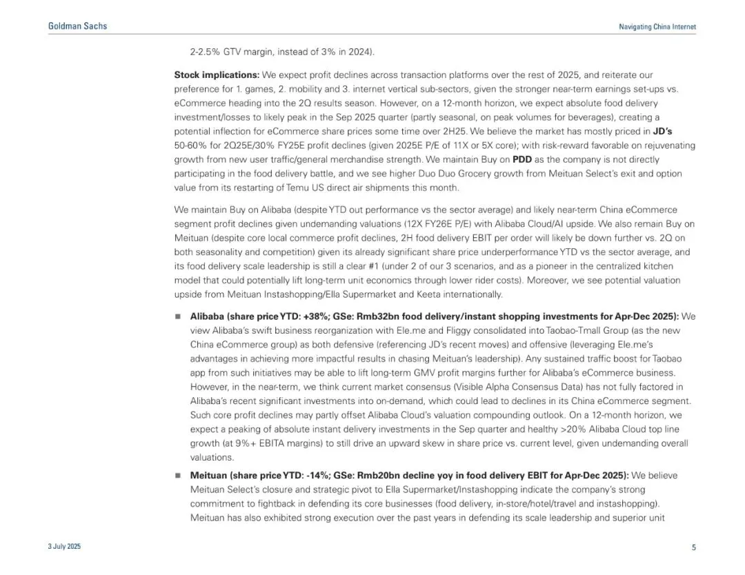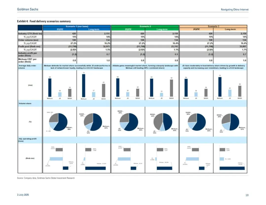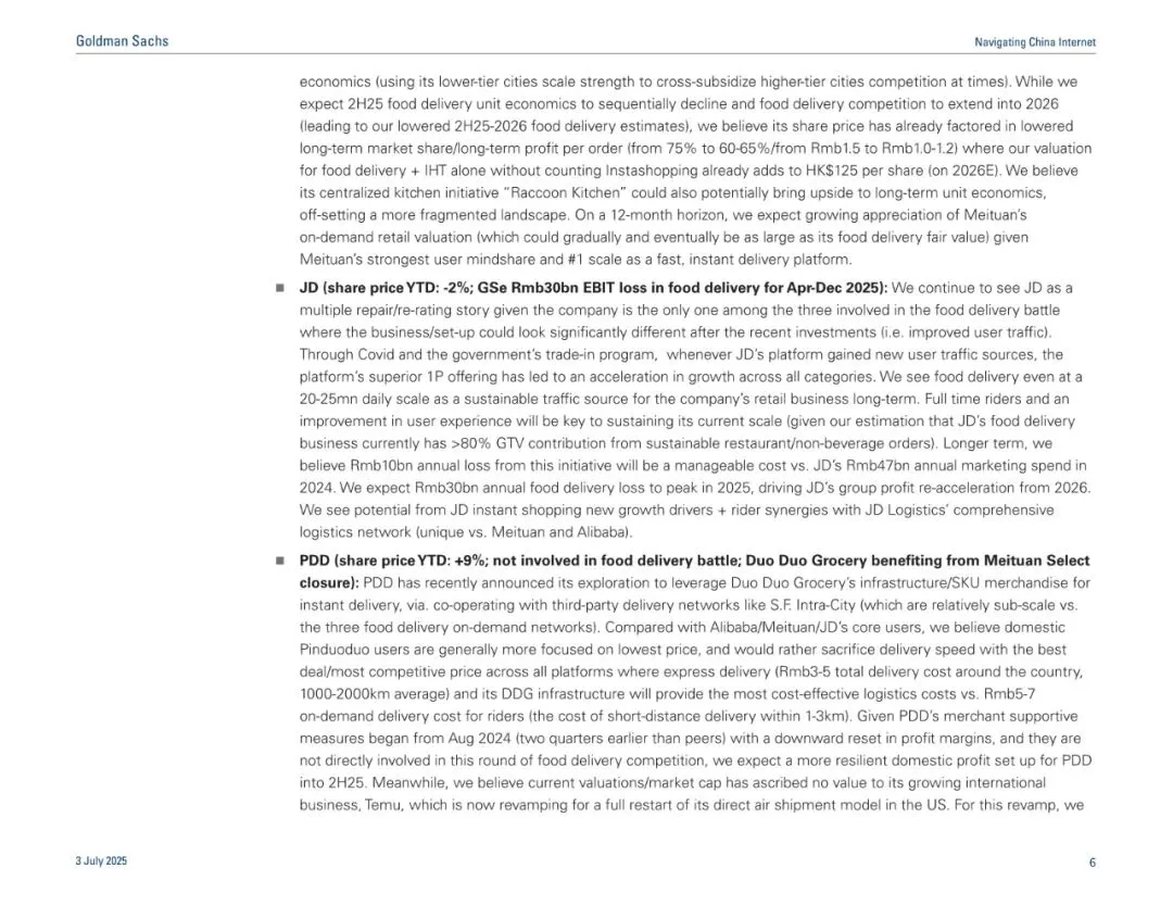 高盛测算,仅2025年6月单季,三大平台在外卖领域的总投资额就达250亿元人民币,远超以往规模。报告警告,这场价格战将持续至2025年9月达到峰值,预计全年阿里外卖业务将亏损410亿元,京东亏损260亿元,美团息税前利润(EBIT)减少250亿元。尽管短期阵痛显著,但高盛认为,通过高频外卖获取流量、交叉销售至高利润业务的战略,有望在中期提升平台整体GMV利润率。