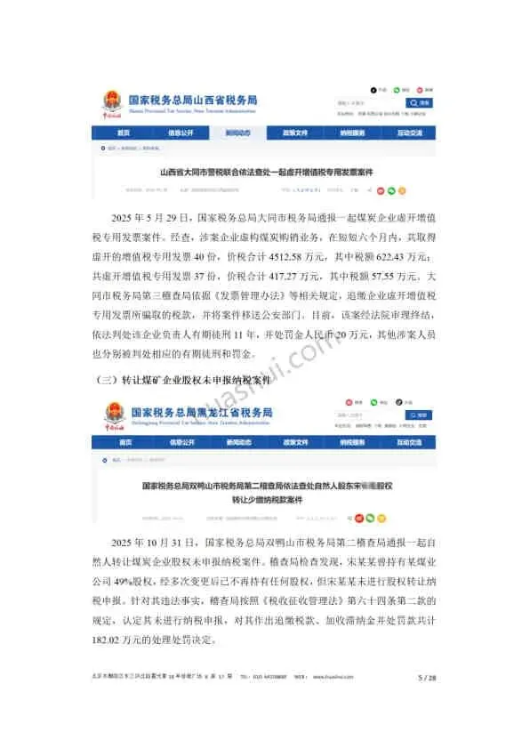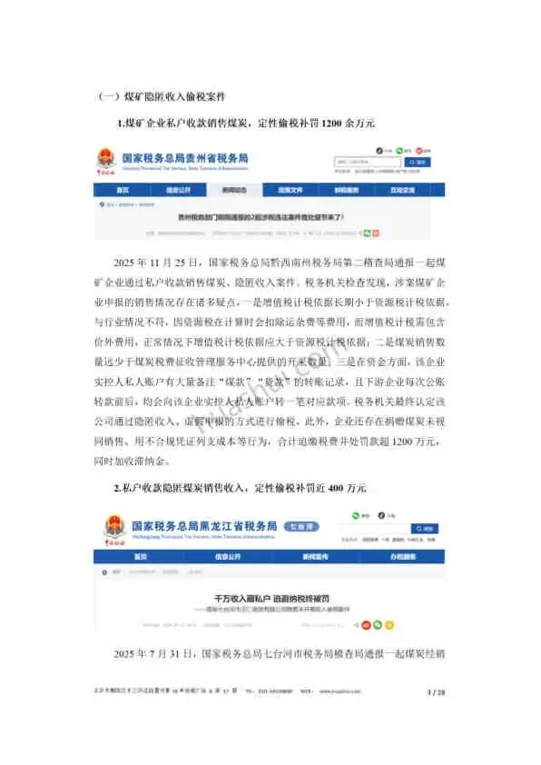 - 隐匿收入偷税: 通过私人账户收款销售超额或无票煤炭,被定性为偷税(案例:贵州某煤矿补罚1200万+)。