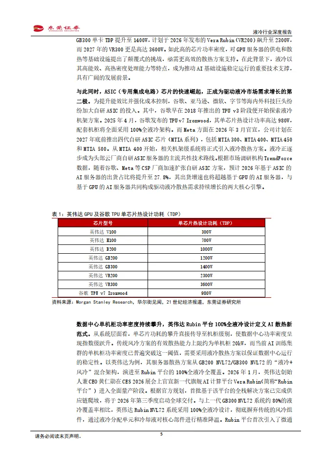 英伟达放权、谷歌直采,大陆厂商迎来直接入局机遇。芯片功耗提升倒逼散热方案升级,驱动液冷组件价值量提升。以英伟达为例,从GB200 升级到G300,单台机柜液冷组件价值量增幅超过20%。预计未来随着 Rubin架构进一步升级,机柜液冷组件价值量有望持续提升。同时,进 入GB300阶段,英伟达已放开液冷供应商权限,仅提供设计参考、接口 规范及合格供应商名单,将具体采购决策权下放至ODM厂商。这一转变 打破了原有封闭的供应体系。此外,以谷歌为代表的云厂商在ASIC服务 器项目中采取直采模式,液冷供应商可作为一级厂商直接对接认证,进 一步降低了供应链层级壁垒。大陆液冷厂商正迎来切入全球高端供应 链、抢占高价值市场份额的战略机遇。