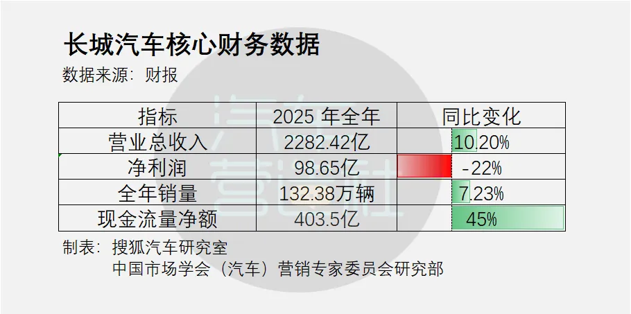 2025年,长城全年营业收入2228.24亿元,同比增长10.20%,创下历史新高;公司全年销量132.38万辆,同比增长7.23%,海外销量50.68万辆,同比增长11.60%,新能源车型销量40.60万辆,同比增长26%。但另一边,归母净利润98.65亿元,同比下滑22.07%,扣非归母净利润更是降至60.59亿元,同比下滑37.50%。