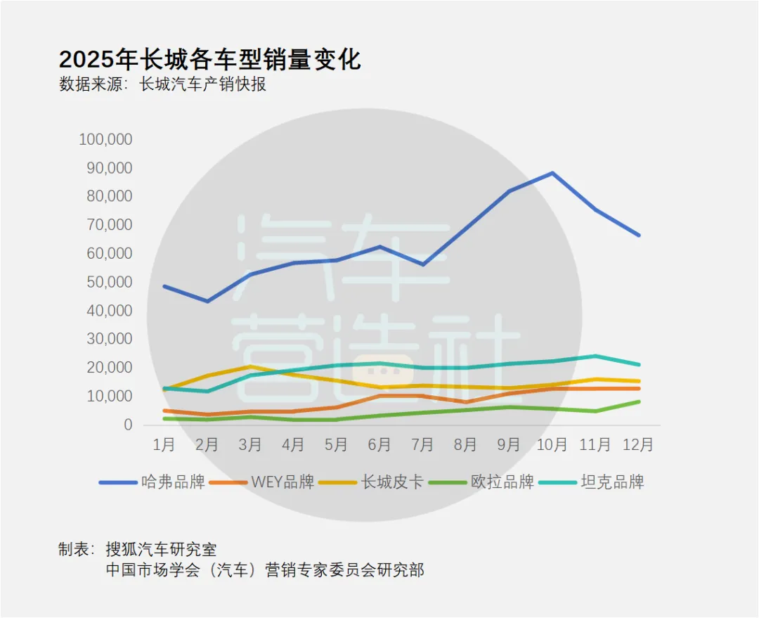 坦克则是长城另一根支柱。2025年坦克品牌销售23.27万辆,同比增长0.74%,全年基本稳定在月销2万辆上下。坦克300、400、500、700面向20万到40万元以上的硬派越野和豪华越野市场,品类总量虽然不如哈弗大,但溢价能力和品牌带动效应更强。从战略层面看,坦克的重要性甚至不低于哈弗,因为它承担着长城品牌向上和利润改善的双重任务。