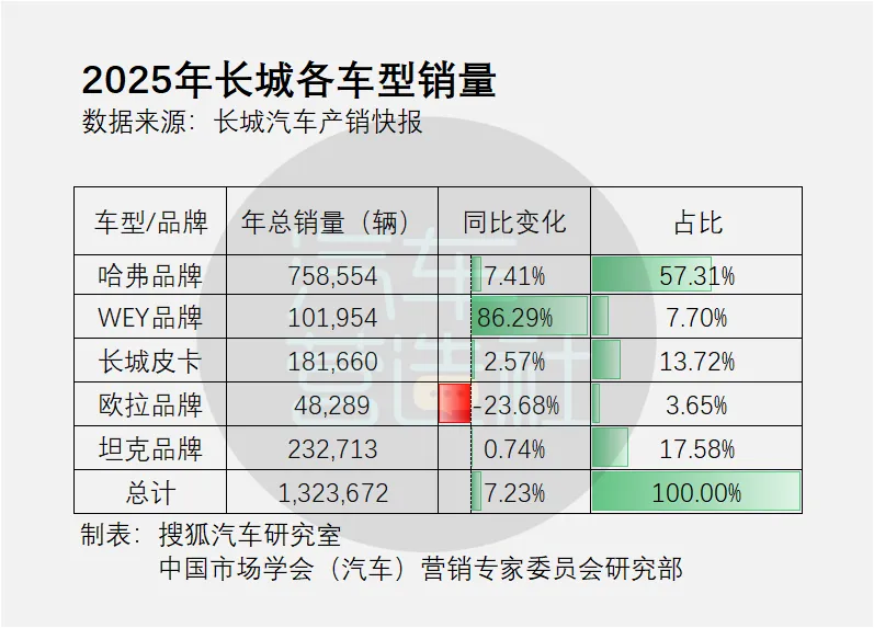十几年来,哈弗品牌也在不断扩张,从最初的H6到后来扩充出的大狗、枭龙、猛龙、H9、H5等车型,产品越来越丰富,但底层逻辑没有变:哈弗定位一直是10万至17万元的大众家用SUV和泛越野车型,本质上都是面向主流家庭用户的规模化产品。到如今,哈弗仍是长城的绝对基本盘,2025年全年销售75.86万辆,同比增长7.41%,占总销量约57%。