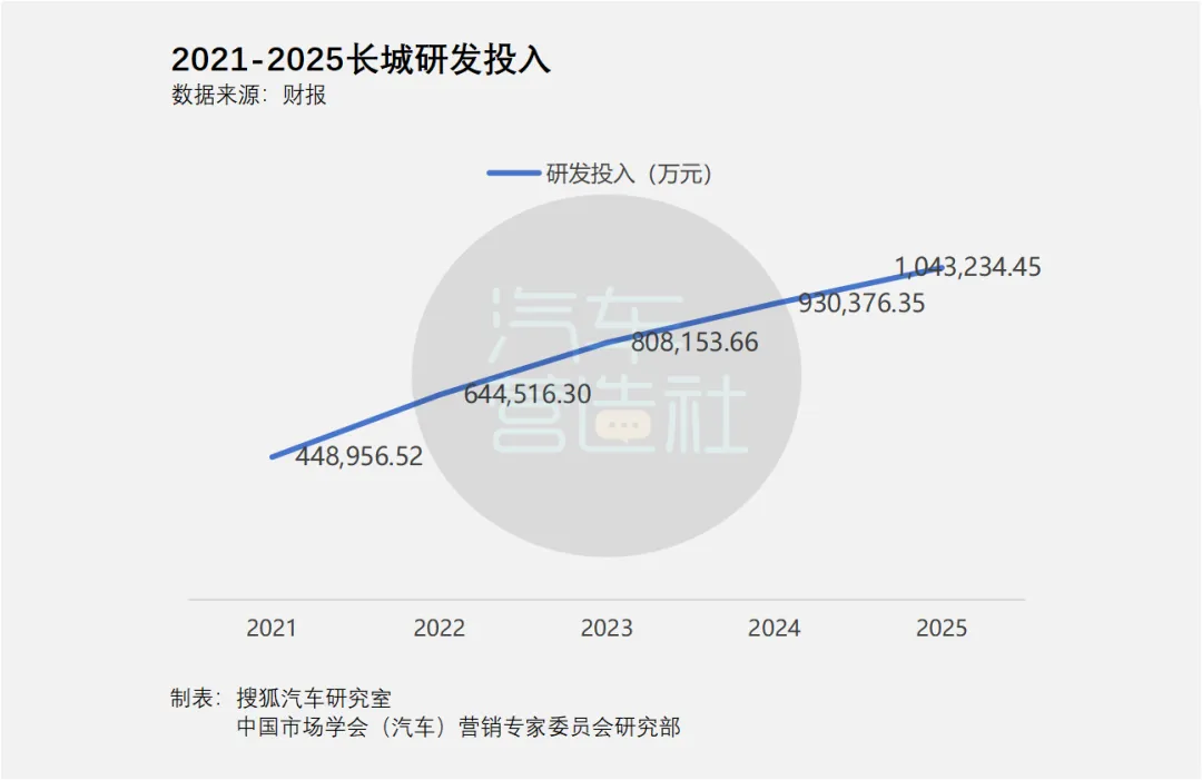 长城把研发摆在了极高优先级。2021年来,长城每年在研发上多投15亿元左右,2025年研发费用破百亿,达到104.32亿元,公司研发人员27097人,占员工总数27.76%。公司管理层也明确表示:“技术研发是公司持续发展的核心支撑。”