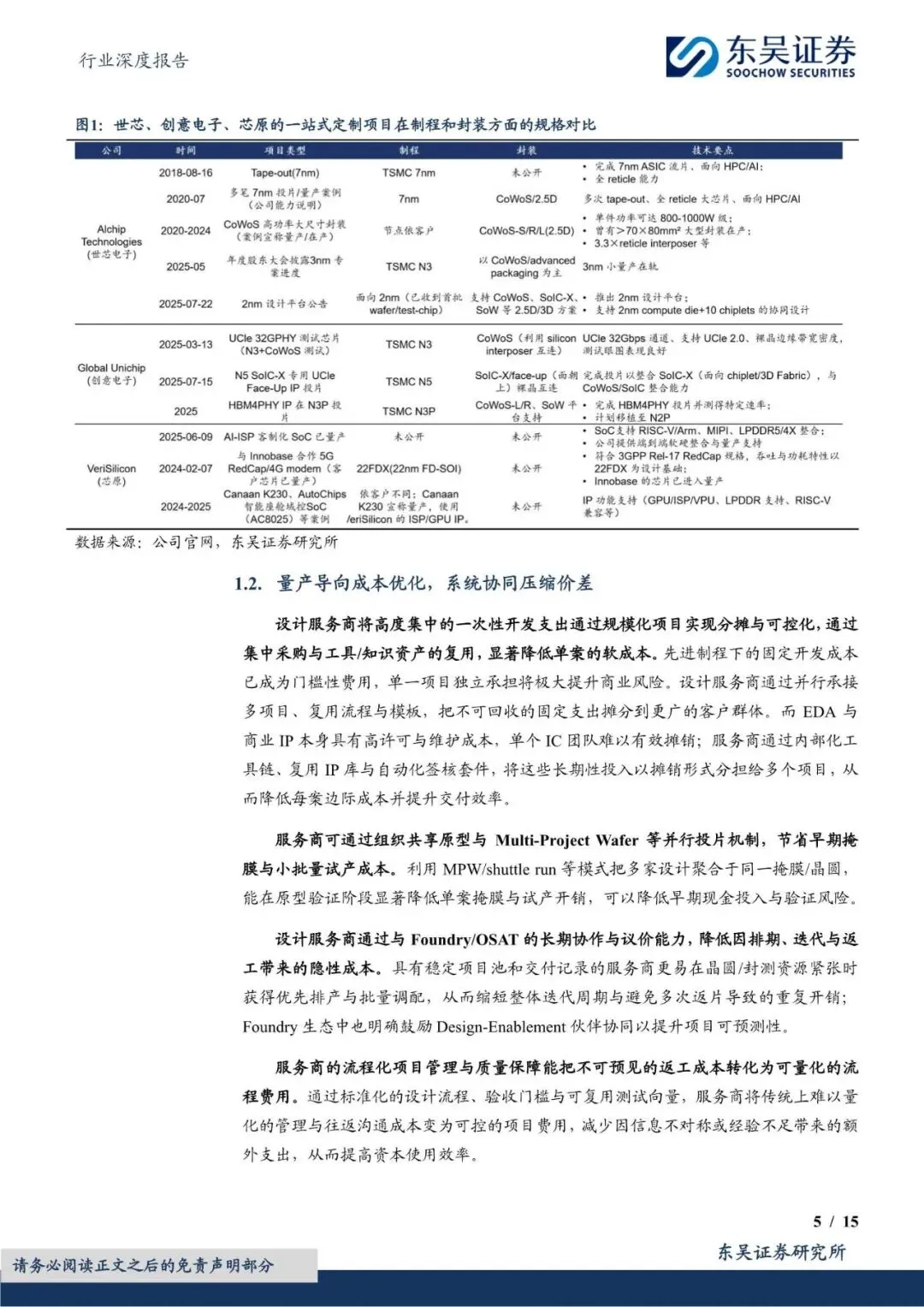 2)成本端:规模效应实现量产导向的成本优化。设计服务商通过多项目并行、IP/EDA 复用及 MPW 机制,将高昂的一次性工程费用有效摊薄;同时凭借其在产业链中的议价权与排产优先级,显著降低了客户的试产风险与隐性迭代成本,推动 ASIC 方案在经济性上具备更强竞争力。