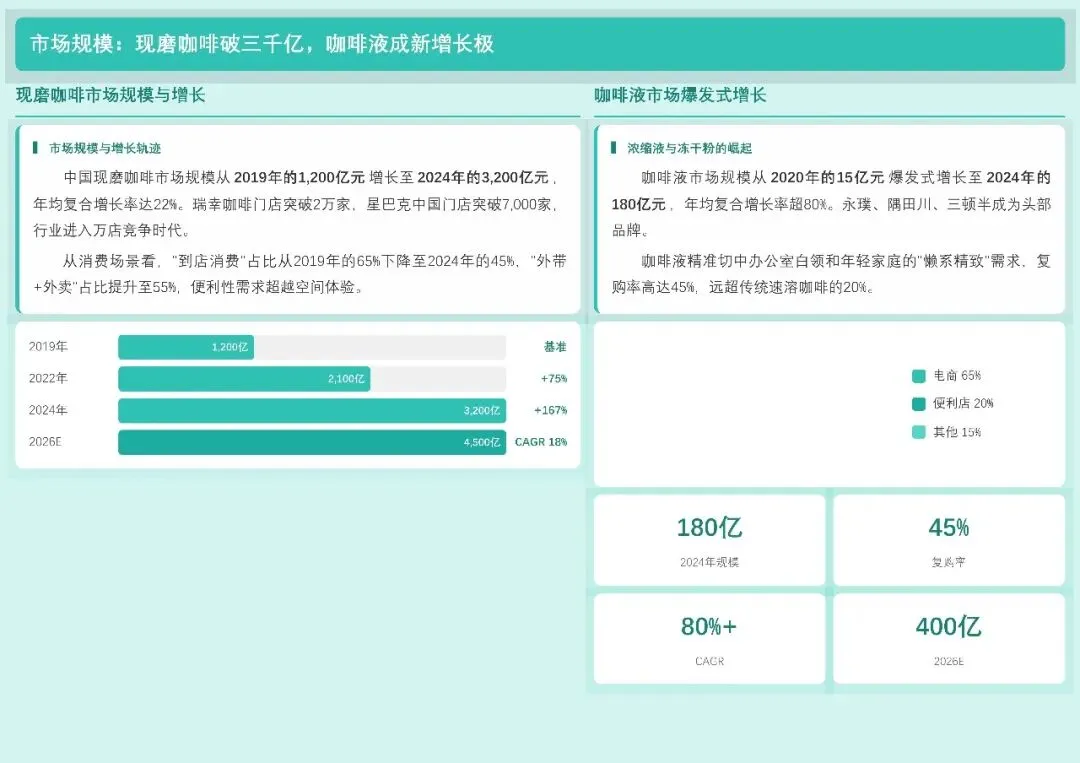 中国现磨咖啡市场规模突破3200亿元,瑞幸与星巴克领跑市场,行业进入万店竞争时代。消费场景从到店转向外带与外卖,便利性需求提升。咖啡液市场爆发式增长,年均复合增长率超80%,永璞、隅田川、三顿半成为头部品牌,精准切中“懒系精致”需求。