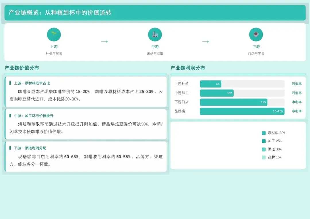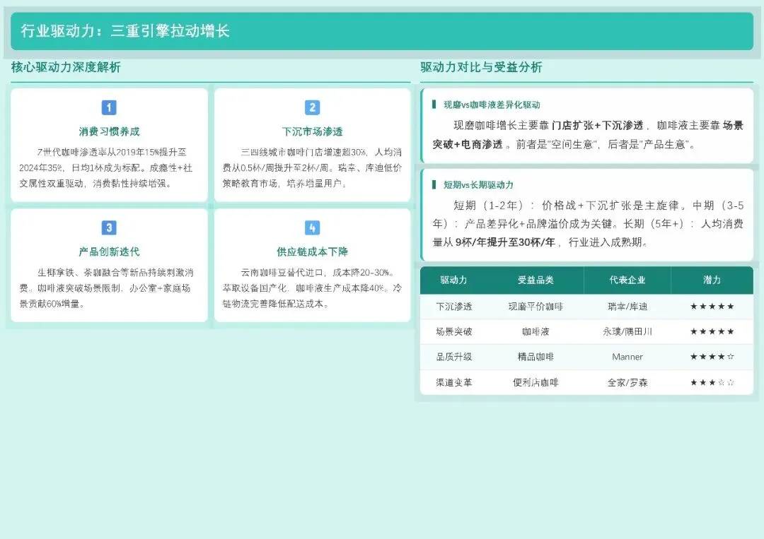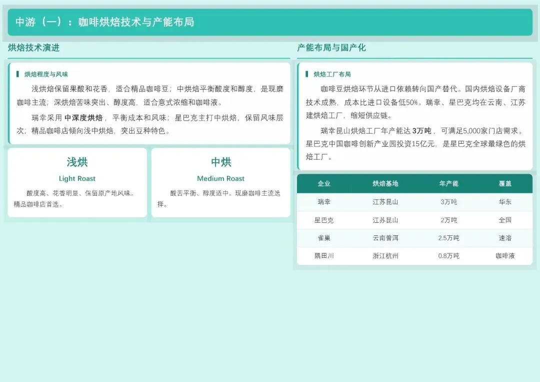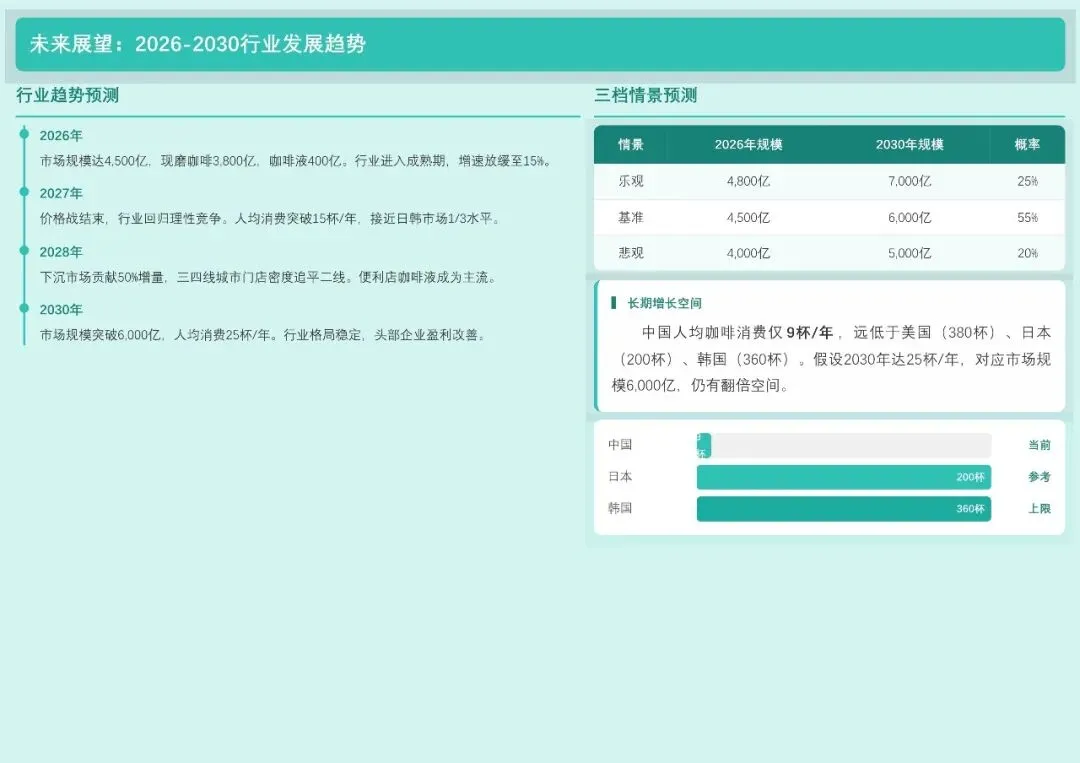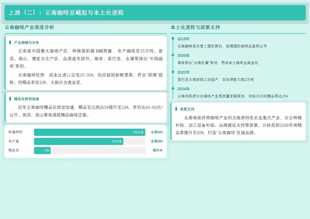 产业链上游,云南咖啡豆崛起,成本比进口豆低20-30%,精品率提升至10%。中游烘焙与萃取技术升级,提升产品附加值。下游渠道多元化,门店、电商、便利店渗透加速。行业面临价格战、同质化、咖啡豆成本波动及监管趋严等挑战。未来,价格战趋缓,产品差异化与下沉市场争夺成为关键,行业人均消费量有望提升,市场规模持续增长。