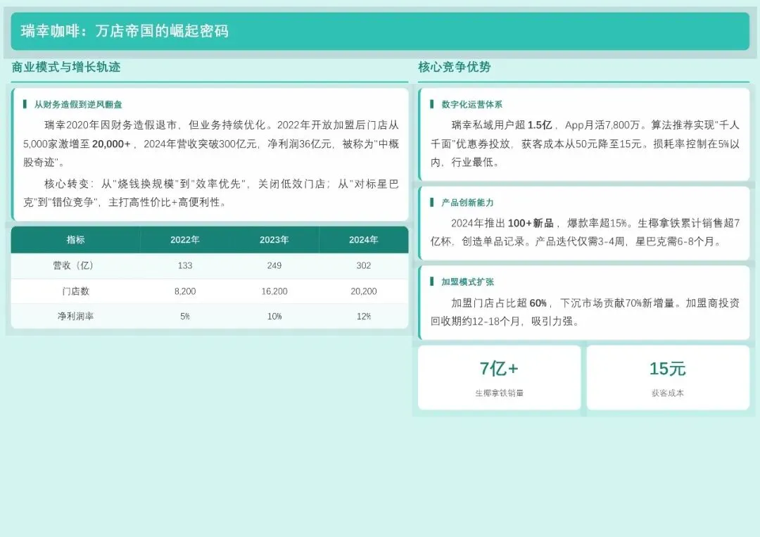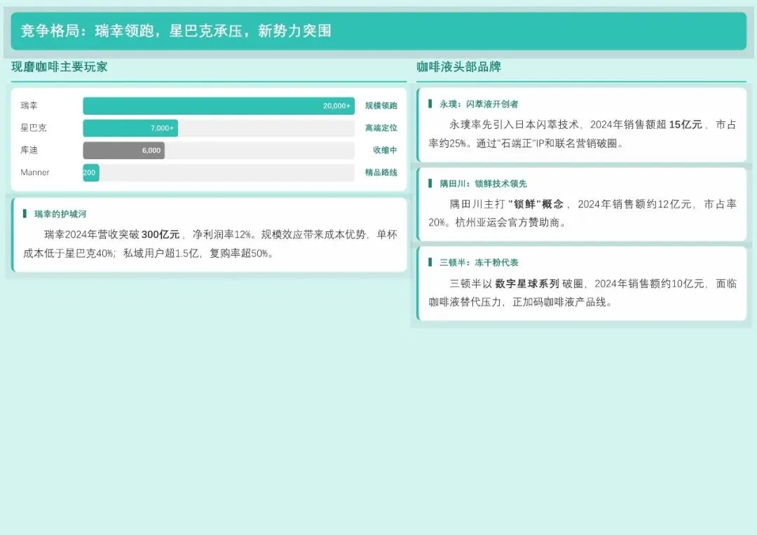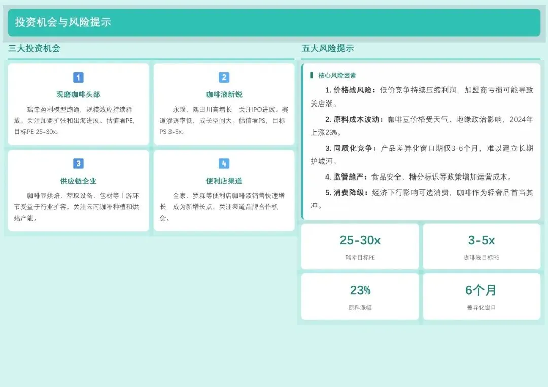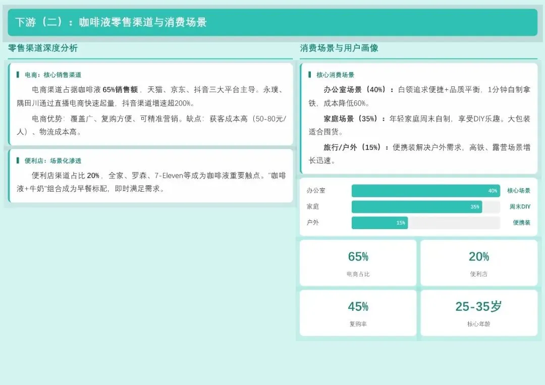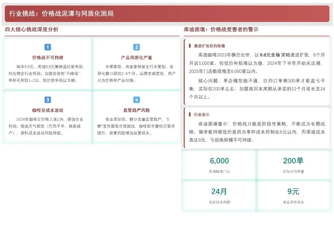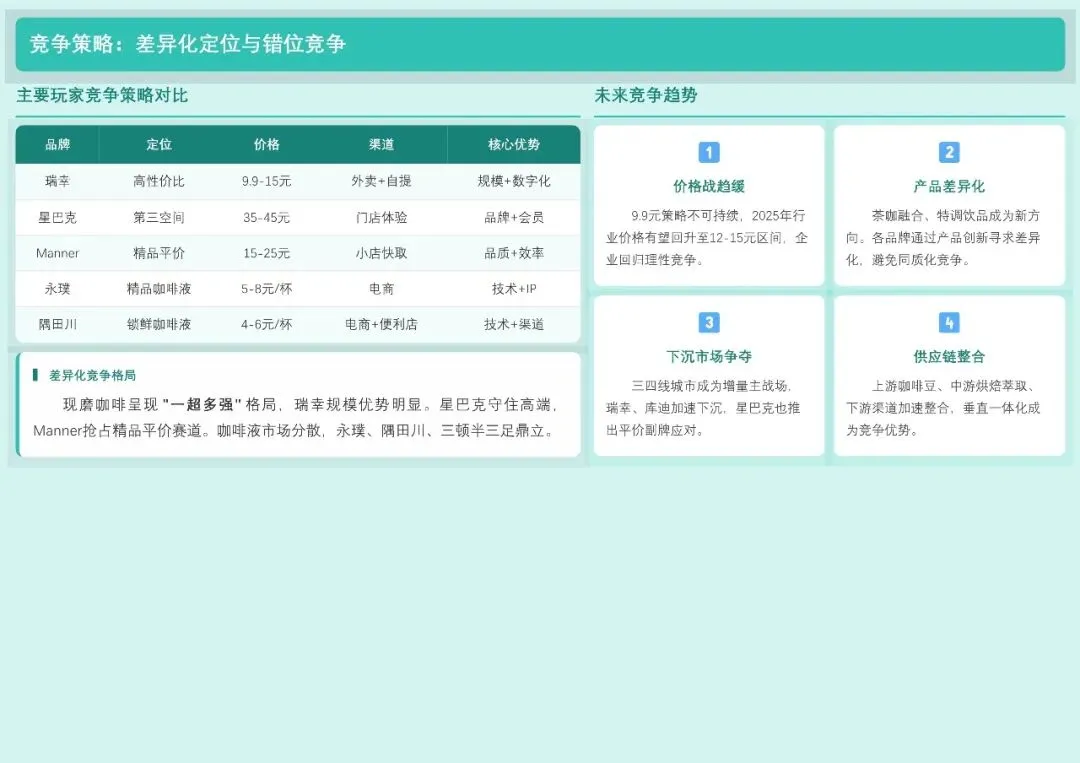 产业链上游,云南咖啡豆崛起,成本比进口豆低20-30%,精品率提升至10%。中游烘焙与萃取技术升级,提升产品附加值。下游渠道多元化,门店、电商、便利店渗透加速。行业面临价格战、同质化、咖啡豆成本波动及监管趋严等挑战。未来,价格战趋缓,产品差异化与下沉市场争夺成为关键,行业人均消费量有望提升,市场规模持续增长。