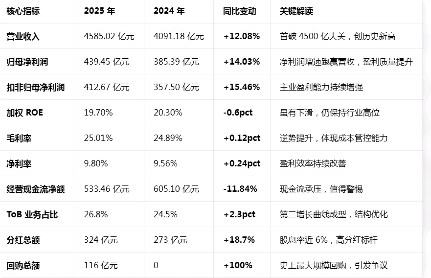 优秀是真的优秀,我就先用豆包给列举一下就好,因为这东西已经不是提供价值的重点了,财技媒体们都会逐一详尽吹捧的。1、经营财务数据上,ROE 下滑,利润四季度增速降低,同比下滑,但营收增长。Q4 单季核心数据:营收 1235 亿元 (+5.69%),归母净利润 108 亿元 (-11%),扣非净利润 101 亿元 (-9.8%)。Q4 单季汇兑收益仅 0.5 亿元,同比大幅减少30.8亿元,直接拉低净利润增速约10个百分点,是利润下滑的绝对主导因素。剔除汇兑影响后,Q4 扣非净利润实际同比增长约 0.2%,也不尽人意。 要知道这是在2025年国补大利好的基础上得到的业绩,2026年的国补已经迎来退坡+上游原材料涨价双重利空,未来1年的路得靠出海增长领导了,但是海外房地产数据也是相当低迷了。看下巨星、泉峰等这种海外地产下游公司的业绩在25年下半年的表现,就知道美的26年的难度了! 2、资产情况。大幅占用上下游款项,B 端业务越来越不灵活,固定资产从21年的228.5亿到现在的450亿,扩张了1倍;各种资产数据的经营指标都反应出了不利的需要改革的情况。3、投并购带来巨大的商誉,在多个领域都展开竞争的情况下,又没有核心竞争优势,想要做到数一数二难度倍增,2025年在集团渠道协同的情况下,并购的公司交出的经营数据不尽人意。美的在家电领域的 "数字化 + T+3" 管理体系,难以直接复制到医疗、电梯、工业自动化等完全不同的行业,管理能力边界显现。4、史无前例的百亿级别激励式回购,近年来19万多名员工构成里,销售人员增长最快最多,公司账户上现金流是充沛状态,但一方面是占用更多的上游供应商货款,另一方面是占用下游的订单款,公司还想着未来三年超600亿规模的总研发投入,每年至少200亿,这就意味着100%分红的情况下,对上下游占款的施压还将继续!有人说注销式回购需要上会审批,但股权激励回购只要董事会层面就行,可以先通过然后改,但能改的掉吗?激励少了,都完不成规模规模还是规模的追求,停了激励,谁给你卖命压榨上下游呢?啥啥都要数一,是要树敌很多的!账上净现金也不是很充足了!我非常敬佩方总的管理能力和价值观,但对美的的商业模式,和这份规模至上的财报不敢苟同。里面很多隐忧实在难以让我看懂5年后它将会怎样,下一个接班人还能否担当重任?