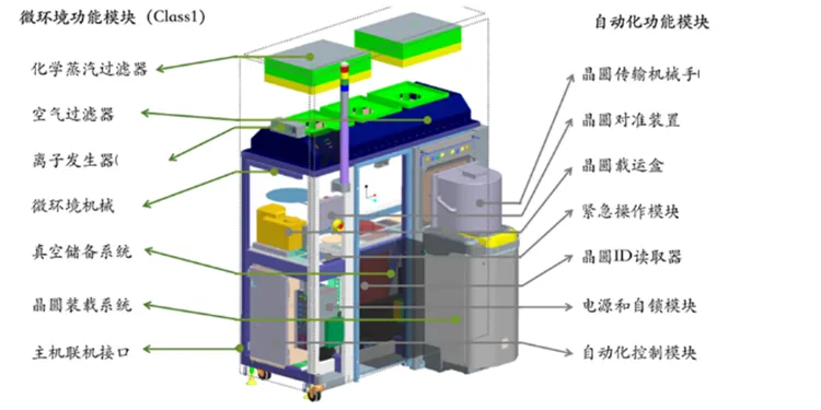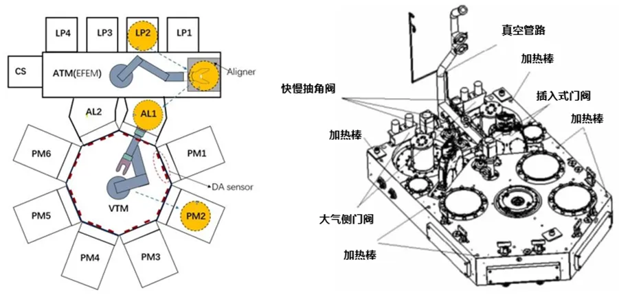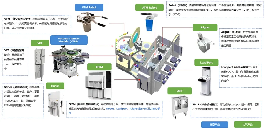 晶圆传输系统是半导体设备中不可或缺的重要模块,在薄膜沉积、刻蚀、量检测、清洗、CMP、离子注入等设备中有广泛的应用。对于具有反应腔室的设备,如薄膜沉积、刻蚀、离子注入设备等,晶圆传输系统可以分为大气产品(在大气环境中工作,EFEM)和真空产品(在真空环境中工作,VTM);而对于清洗、CMP、量检测设备等,晶圆传输系统以大气产品为主。1.2 EFEM(Equipment Front End Modules,设备前端模块)EFEM主要由大气机械手、晶圆装载端口(Loadport)、预对准装置(Aligner)组成,主要起到连接物料搬运系统与晶圆处理系统的桥梁作用。工作时,大气机械手尾部传感器扫描晶圆装载窗口(待加工硅片) 中硅片的数量,并检测有无晶圆叠片或者碎片(Mapping), 然后从中取出硅片,放置在预对准装置上,预对准装置对硅片进行预对准后,大气机械手将硅片传输到真空传输腔室。晶圆装载端口是连接EFEM与晶圆厂加工中心的桥梁,是EFEM的前端部分。其工作流程为OHT(天车系统)搬运晶圆盒至装载平台→装载平台上的夹紧机构锁紧晶圆盒→开盒装置吸附或夹持晶圆盒门→运输机械手对晶圆进行搬运→开盒装置对晶圆盒门和晶圆盒进行合并→夹紧机构对晶圆盒进行解锁→OHT搬离晶圆盒。预对准装置是在晶圆被传输至加工工位前,事先对晶圆旋转并进行预对准的系统。预对准的目的是对晶圆的中心位置和晶圆边缘的缺口位置进行定位,对圆心位置进行定位补偿,并将缺口方向旋转到指定的方向。1.3 VTM(Vacuum Transfer Module,真空传输平台)VTM是半导体设备中的真空传输模块,具有高度集成一体化的特点。传输腔室上有真空机械手安装孔、EFEM接口、真空系统接口、充气系统接口、腔室冷却系统接口、工艺腔室接口和AWC(光电对射)传感器。VTM外形设计有两个缓存密封接口,与EFEM相连接;设计有多个侧面,并提供安装工艺腔室的密封接口,可与工艺腔室连接;侧面的几何中心安装真空机械手,以此保证半导体晶圆在传输加工过程中均在高真空密封腔室中,保证精度与洁净度。另外为保持真空,VTM还要集成真空管路、门阀、角阀、低温泵、加热装置等。VTM工作流程如下:Aligner转好角度之后,大气机械手会抓取晶圆,将其送入Air Lock(大气真空转换的空间)。真空机械手在Air Lock中将晶圆抓取, Air Lock和反应腔靠近VTM一端有AWC传感器,会对晶圆的圆心进行计算,必要时进行补偿,相差过大时报警。真空机械手将晶圆传进反应腔开始晶圆工艺。待工艺结束后,再将晶圆逐步传到Air Lock ,再由大气机械手将其传出。与传入不同的是,晶圆传出过程中不再经过Aligner,部分工艺会产生副产物,可能会对尚未开始工艺的晶圆产生不良影响。此时,大气机械手会将晶圆暂存在CS (cooling station),待所有晶圆完成工艺后,再统一传出。图3. VTM俯视及测试结构图(数据来源:《300mm硅片高精度真空传输系统设计》、公开资料)机械手是EFEM与VTM中搬运晶圆的必备工具,需要极高的控制精度、运动速度、稳定性和可靠性,并且要在高洁净度的环境中运行。根据其使用环境,可以分为大气机械手及真空机械手,其中真空机械手对洁净度、精确度、晶圆固定方式等有更高的要求,并且由于真空机械手直接进入工艺腔,其技术壁垒和市场壁垒更高。根据其运动形式,半导体机械手主要分为R-θ 型(圆柱/极坐标型)、SCARA型(关节型)及蛙腿型(对称连杆型)。| 类型 | 简介 | 示意图 |