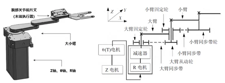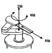 | R-θ型机械手 | 机械手有3个自由度,分别包括R轴(径向运动)、θ 轴(旋转运动)和Z轴(上下运动)。此结构的机械臂是通过带传动机构实现径向运动,其末端执行器始终指向旋转轴轴心,结构的突出特征是电机借助较复杂的带传动实现对前后臂关节的回转驱动,进而实现晶圆传输,机械手的手臂可以沿径向做直线运动。R-θ型机械手手臂结构紧凑、可靠性高,但刚性相对较低 | |