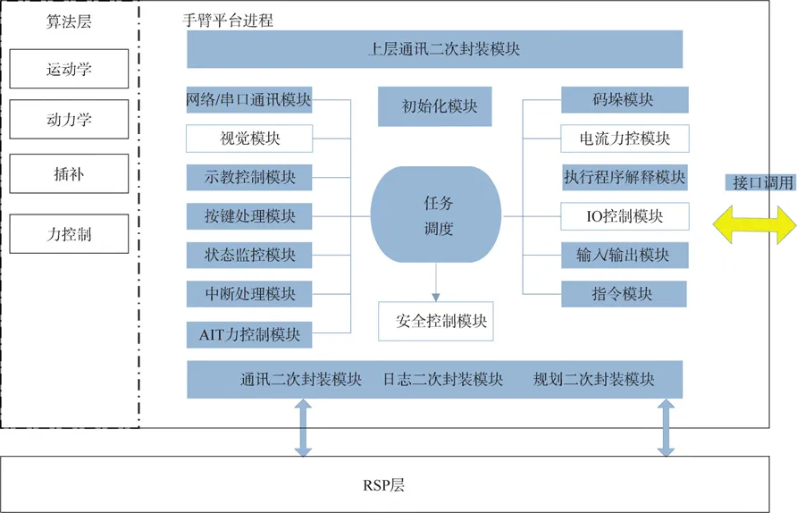 以R-θ型机械手为例,机械手由片叉(末端执行器)、腕部关节、电机、减速器、固定轮等组成。其中R轴电机经由谐波减速器后与大臂相连,大臂固定带轮与轴输出端固连;大臂从动带轮通过大臂同步带与大臂固定带轮相连且直接与小臂相连;小臂从动带轮通过小臂同步带与小臂固定带轮相连且直接与末端手相连。其核心部件片直接与晶圆接触,结构设计和材料的选择对传输机械手的精度、效率和可靠性以及洁净度等都会产生影响。末端执行器的基本尺寸应该满足料盒的尺寸规格,并通过结构设计、材料选择等减少运动惯量、增加结构刚度、优化片叉尺寸、选择接触方式。图4. R-θ型机械手架构及传动机理(数据来源:《晶圆传输机械手的实现途径及其结构设计》)机械手软件架构:主要由处理器、控制器系统、规划模块、RSP通信层等组成。其中,处理器用于运行运动控制算法、机器人算法、机器人任务分配、机器人引用中的一种,通过与共享内存进行数据交互,获取包含机器人变量、通讯方式的信息;控制器系统用于获取运动控制指令,并反馈机器人的状态信息;规划模块用于按一定的算法对机器人的位置进行数据点的插补细化工作;RSP通信层用于提供运动控制算法,通过处理器获得机器人位置、速度,并发给机器人控制器以完成平台的运动控制。