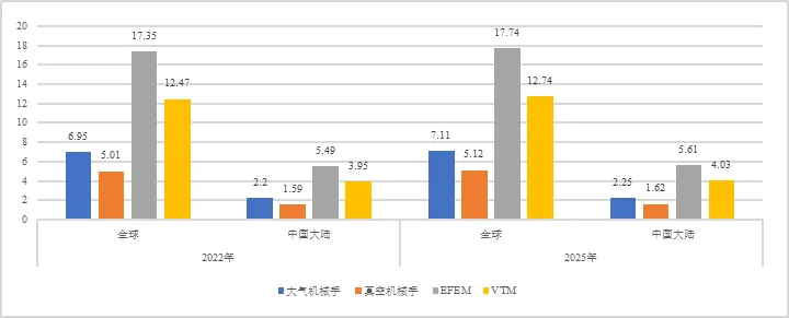 图5. 机械手软件架构示意图(数据来源:《基于真空机械手运动控制与最优轨迹规划算法研究》)安芯投资根据国内主要半导体设备上市公司采购直接材料占比及毛利率,测算出半导体设备直接材料成本占半导体设备市场比例,并参考各类设备龙头公司数据,得出机械手及EFEM、VTM占直接材料成本比例,最后得出半导体机械手及EFEM、VTM等模组相应的市场规模。根据测算,2022年全球大气机械手市场规模为6.95亿美元,真空机械手市场规模为5.01亿美元,EFEM市场规模为17.35亿美元,VTM市场规模为12.47亿美元。中国大陆市场规模占全球的32%左右。