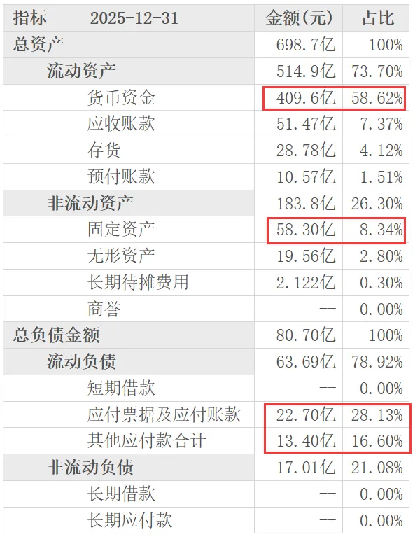 资产负债表,总资产698亿,总负债80.7亿。其中409亿是货币资金,其他的就不用多说了吧。