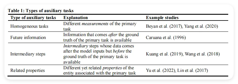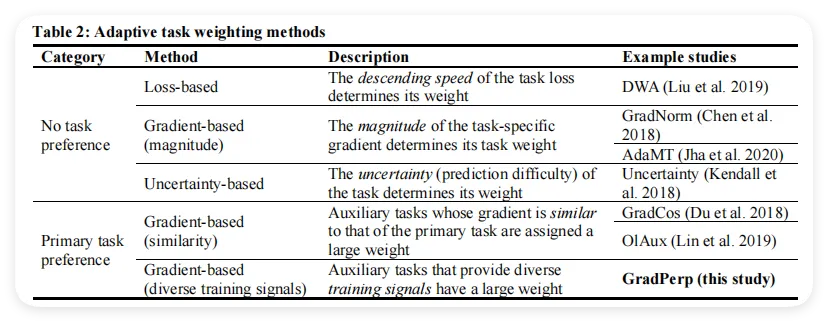 直觉上,这个公式的意思就是:模型要同时把主任务和所有辅助任务都尽量预测准,但不同任务的"重要程度"由权重 来控制。其中 是主任务的权重, 是第 个辅助任务的权重,所有权重加起来等于1,且这些权重本身也是模型在训练过程中自动学习调整的(具体方法见2.5节的GradPerp)。需要特别注意的是:虽然训练时要同时优化所有任务,但测试和评估只看主任务的预测效果——辅助任务的作用是在训练阶段帮主任务学得更好。