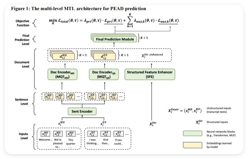 输入方面,模型有两类数据来源。第一类是非结构化输入,也就是财报电话会议的文字记录(Earnings Call Transcript)。每家公司每个季度都会开一次电话会,论文把这段文字记为 ,其中 是管理层讨论环节(Management Discussion)的文本, 是问答环节(Questions & Answers)的文本。之所以要把这两段文字分开处理,是因为研究发现两个环节在语言风格和信息含量上有明显差异——管理层讨论通常是提前准备好的,而问答环节更能反映管理层对突发问题的即时反应。第二类是结构化输入,包含16个人工提取的财务指标,比如盈余惊喜(earnings surprise)、管理层情绪得分等,这些都是金融文献中已经验证过对PEAD有预测力的特征。