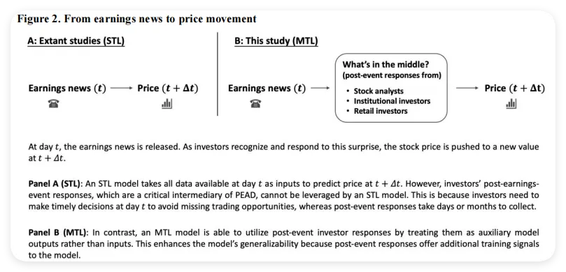 这个多任务框架对比传统的单任务学习(只预测PEAD)有什么好处?图2清晰地回答了这个问题:传统方法忽视了盈余新闻和股价运动之间的"中间桥梁"——投资者的事后反应。而MTL框架可以把这些事后反应变成辅助任务,在训练阶段"偷听"这些信号,却不需要在预测时等待这些数据的收集,从而实现了即时预测和利用后验信息的两全其美。