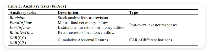论文将这套辅助任务命名为FinAux,共包含以下六个指标(见表3):