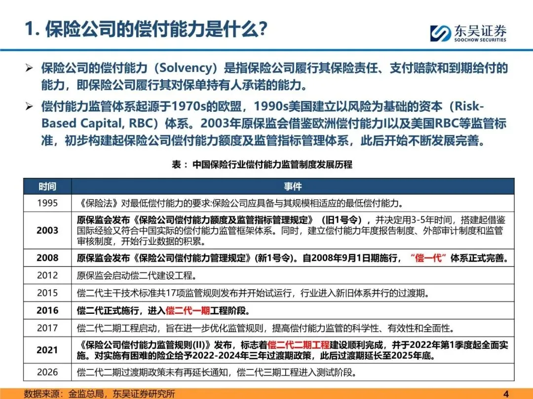 保险公司的偿付能力是什么?保险公司的偿付能力(Solvency)是指保险公司履行其保险责任、支付赔款和到期给付的能力,即保险公司履行其对保单持有人承诺的能力。2003年原保监会借鉴欧洲偿付能力I以及美国RBC等监管标准,初步构建起保险公司偿付能力额度及监管指标管理体系,此后开始不断发展完善。