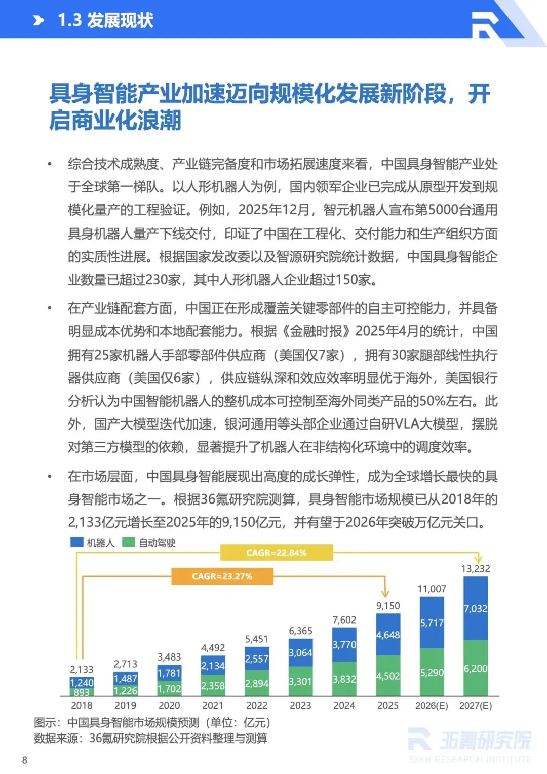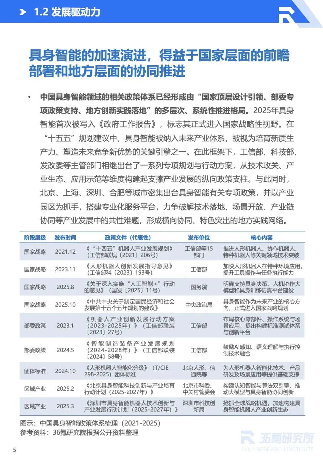 :政策层面,具身智能纳入国家未来产业战略,地方专项政策协同推进;技术层面,大模型、多模态融合、仿真训练等突破推动机器人适配复杂场景;需求层面,人口老龄化、劳动力短缺催生替代需求;资本层面,2025 年融资额超 380 亿元,产业资本与创投机构积极布局。2025 年市场规模达 9150 亿元,2026 年有望突破万亿元。 - 产业生态逐步完善,上下游协同升级