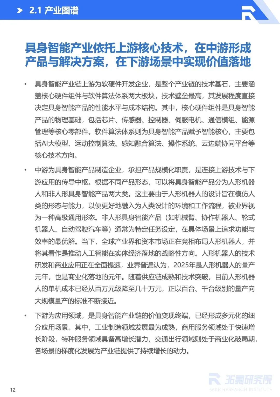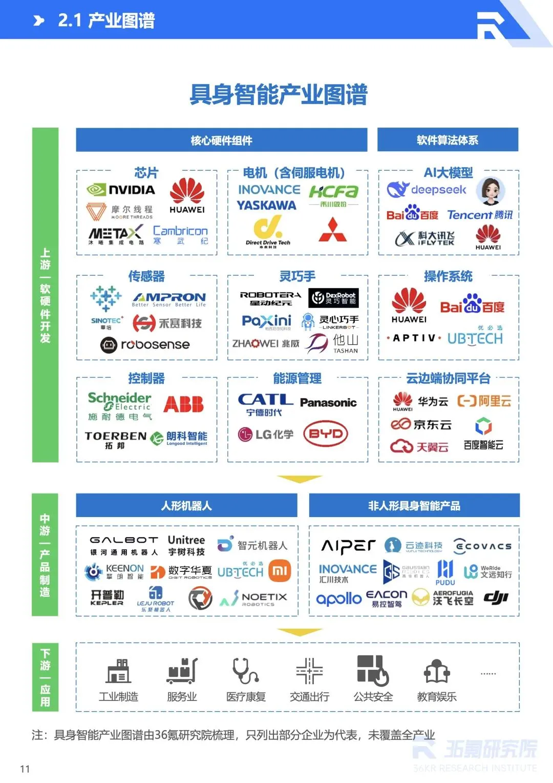 :工业机器人向 AI 自主化与 IT/OT 融合发展,在汽车制造、电子电气等场景替代传统设备;服务机器人聚焦家庭清洁、养老陪伴等细分场景,轻量化、实用化趋势明显;自动驾驶载具推动交通系统协同化、立体化,端侧大模型提升感知决策能力,低空出行生态逐步构建;特种机器人在极端环境适配能力提升,覆盖灾害救援、能源巡检等高危场景。 - 典型企业引领行业发展,生态竞争成未来焦点