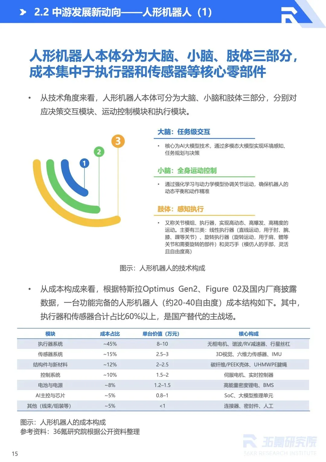 :上游以软硬件开发为核心,AI 大模型提供认知能力,传感器、电机等硬件标准化加速推进,但高端部件仍依赖进口;中游分为人形与非人形机器人,人形机器人进入规模化放量关键期,2026 年预计产量达 10-20 万台,成本持续下探,非人形机器人在垂直场景规模化应用;下游覆盖工业、服务、特种、交通出行领域,场景渗透沿技术成熟度逐级展开。 - 人形机器人成核心赛道,技术与商业化双突破