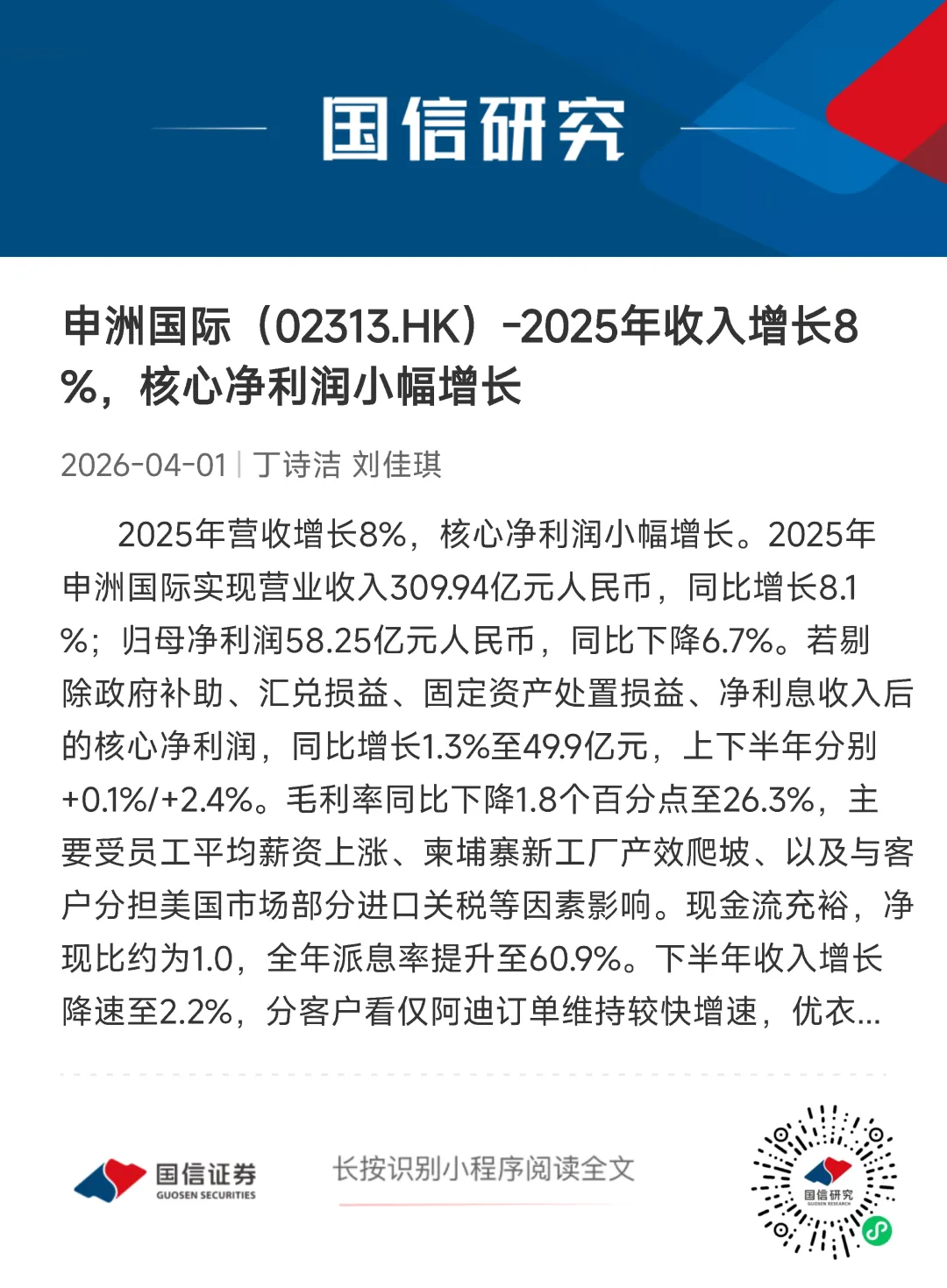 报告名称:《国信证券-财报点评:申洲国际(02313.HK)-2025年收入增长8%,核心净利润小幅增长》