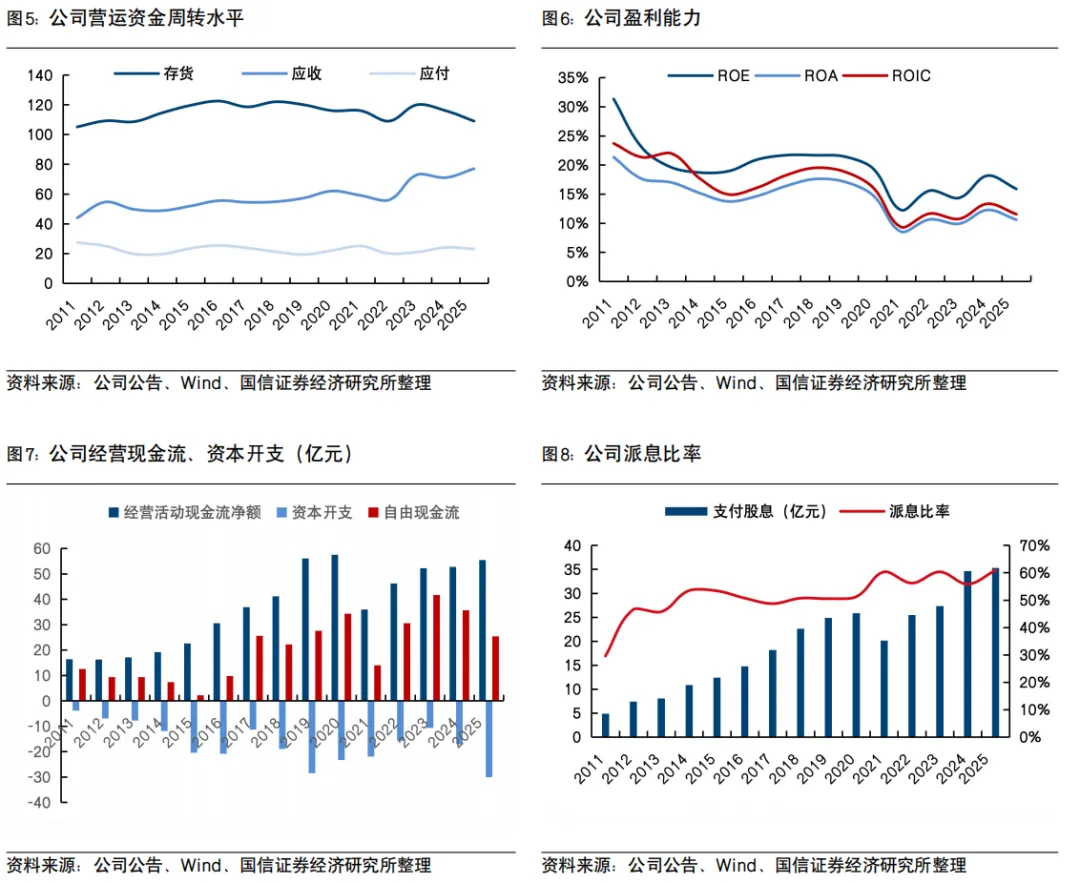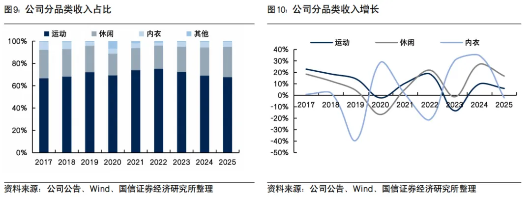 2025年公司营业收入309.9亿元,同比增长8.1%;归母净利润58.3亿元,同比下降6.7%。若剔除政府补助、汇兑损益、固定资产处置损益、净利息收入后的核心净利润,同比增长1.3%至49.9亿元,上下半年分别+0.1%/+2.4%。毛利率:毛利率同比下降1.8个百分点至26.3%,毛利率下降主要因员工薪资上涨、柬埔寨新成衣工厂投产后运行效率尚在提升期导致人工成本占比上升,以及为销往美国市场的产品分担了部分进口关税,其中关税分担对全年毛利率大约造成0.5百分点的影响。费用率及其他收入:销售费用率同比-0.2百分点、管理费用率持平。其他收入中,政府补助和利息收入占比分别+0.6/-0.3百分点。对利润产生较大影响的非经项目主要包括2024年上海物业处置一次性收益3.3亿元,以及2025年汇兑损失较2024年差额为3.6亿元。净利率:受毛利率下滑及汇兑损失影响,归母净利率同比下降3.0个百分点至18.8%。营运情况:存货、应收、应付周转天数分别109、77、23天,同比-7/+6/-1天,整体资金周转效率稳定。资产负债率保持在34.2%的较健康水平。经营性现金流净额约为55.49亿元,同比增长约5.2%,净现比约为1.0。产能及人员方面:1)资本开支:2025年于物业、厂房及设备和预付土地租赁款项的总投资约30.04亿元,较2024年17.1亿元大幅增长;2)集团员工人数:员工人数增加至约108,680人,同比+5.8%。派息率:派发末期股息1.20港元/股,叠加中期的1.38港元/股,全年派发2.58港元/股,全年派息率提升至60.9%。阿迪和欧美地区增速领先,收入保持20%以上较快增长分品类收入:2025年运动/休闲/内衣分别同比+5.9%/+16.7%/-2.3%,占比分别为67.6%/27.1%/4.5%,其中休闲服饰表现较好。