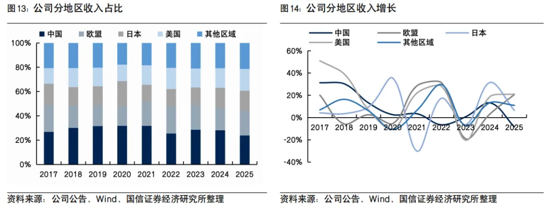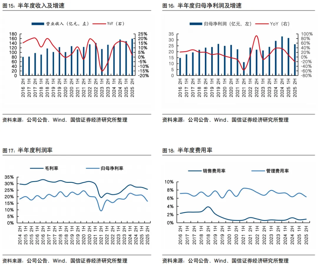 分客户收入:前三大客户客户甲/乙/丙分别同比+13.7%/1.8%/28.7%,占比分别为29.3%/24.3%/20.8%;其他客户收入-4.0%,占比25.6%。预计阿迪达斯表现最佳;优衣库增速相对稳定、主因2024年基数较高;耐克主要受公司自身处于调整期影响增速较缓。分地区收入:中国/欧盟/日本/美国分别同比-8.4%/+20.7%/+6.4%/+21.1%,占比分别为23.8%/20.2%/16.6%/18.0%;其他地区收入+10.9%,收入占比21.4%。下半年收入增速放缓,盈利主受关税和汇率影响下滑