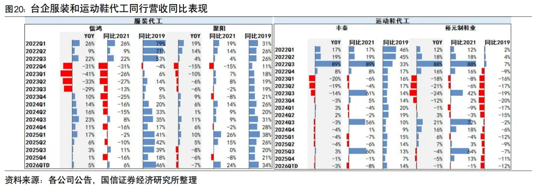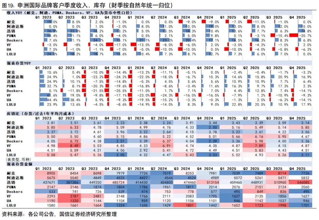 2025下半年收入增长降速至2.2%,分客户看仅阿迪订单维持较快增速,优衣库订单增长降速,耐克和其他品牌整体出现同比下滑;分地区看中国和日本市场下滑。毛利率同环比下降至25.6%,预计主受美国关税政策影响;汇兑损失扩大,占收入比例同比-2.6百分点。主受毛利率下滑和汇兑损失影响,归母净利润同比-20.0%至26.5亿元;核心净利润同比+2.4%。申洲增长表现好于品牌自身销售与同行,海外产能持续释放1、对比品牌:申洲收入表现好于主要客户,份额进一步提升。最近一年品牌客户表现承压的如耐克品牌,收入连续下滑,到自然年25Q4企稳,而申洲的订单仍有增长;表现较好的品牌如阿迪达斯、优衣库,收入增速在低双位数上下,而申洲全年两个品牌客户收入增长均超过14%。未来若大客户耐克恢复增长势头,申洲有望进一步受益。国际品牌:Adidas预计2026年收入按固定汇率增长高单位数;PUMA预计全年收入按固定汇率降低中单位数;迅销指引全年增长约10%;Lululemon指引全年增长大约2-4%。国产品牌:李宁/安踏/特步/361度分别指引主品牌2026年流水增长高个位数、低个位数、低个位数、8~10%。2、对比同行:申洲份额最大且仍在提升,展现竞争优势。相比其他运动服代工同行,申洲作为规模最大的龙头公司经历了品牌库存调整后仍呈现出更快的增长势头,市场份额仍在继续提升。例如:(1) 晶苑国际,2025年收入26.4亿美元,同比增长6.9%,比2022年收入增长6.0%;(2) 儒鸿,2025年收入379.9亿新台币,同比增长3.2%,但比2022年收入下滑4.4%;(3) 聚阳实业,2025年收入344.3亿新台币,同比下滑3.1%,比2022年收入增长7.3%。1)海外产能:越南第二面料工厂已完成生产主体的土建工程及部分设备安装,正推进剩余设备安装与调试。柬埔寨新建成衣工厂已聘用员工约5400人,规模接近预期用工的九成,生产效率已达正常水平的约85%。集团正在规划于印度尼西亚投资建设新的成衣生产基地。2)国内基地:新建织布工厂实现生产管理集中化和自动化水平提升;宁波基地制衣工厂完成全面整修翻新,增设自动化设备并优化流水线布局;安徽成衣基地正在开展全面技术改造,已新购置土地约16公顷,一期项目土建工程即将竣工。3)员工人数:截至2025年12月31日,集团共雇佣约108,680名员工,较2024年的102,690名有所增加。员工成本总额占销售额约28.1%,较上年上升约0.5个百分点。相关报告