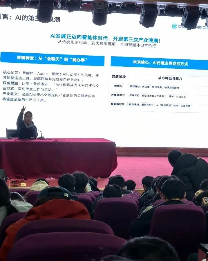 由衢州网易联合创新中心与衢州职业技术学院主办的《AI应用行业发展趋势与人才需求》专题培训讲座,于3月26日19:00 在衢州职业技术学院一号报告厅成功开展。讲座特邀网易智企运营及企业培训负责人杨老师担任主讲。来自信息工程学院计算机、人工智能、大数据等专业的五百余名学生齐聚报告厅听讲,现场座无虚席,学习氛围浓厚。