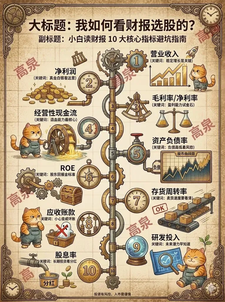 小白读财报总踩坑?只看净利润和 PE,业绩最好时冲进去,结果成了主力的‘接盘侠’~ 其实财报要看‘未来’!看懂现金流、负债率、毛利率等 10 大核心指标,才能先人一步发掘 10 倍成长可能~ 毕竟股市炒的是未来预期,别再被表面数据骗啦~(投资有风险,入市需谨慎~)