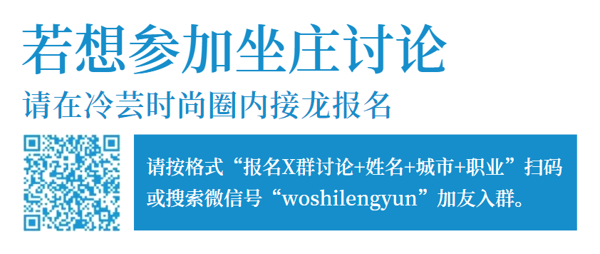坐庄讨论是冷芸时尚圈的一项经典交流活动,我们将把参与者单独拉群,以文字形式进行主题讨论。下文会对本周5个群的坐庄讨论进行介绍,如果你对其中一项感兴趣,欢迎阅读文末的方式加友入群,在对应社群内接龙报名。所有报名者都必须参与讨论。如果因为特殊情况不能及时参与讨论,可以在活动开始前1小时@对应副群主,得到确认后退出,不受任何处罚。否则将失去参与坐庄讨论的权利1年。坐庄开始1小时后,还未参与讨论者,将被视为未参与讨论,会被退出坐庄群,且失去讨论权限1年。坐庄讨论有效发言(不包括表情包,嗯啊谢谢)少于10句,则视为无效发言,失去讨论权限1年。
