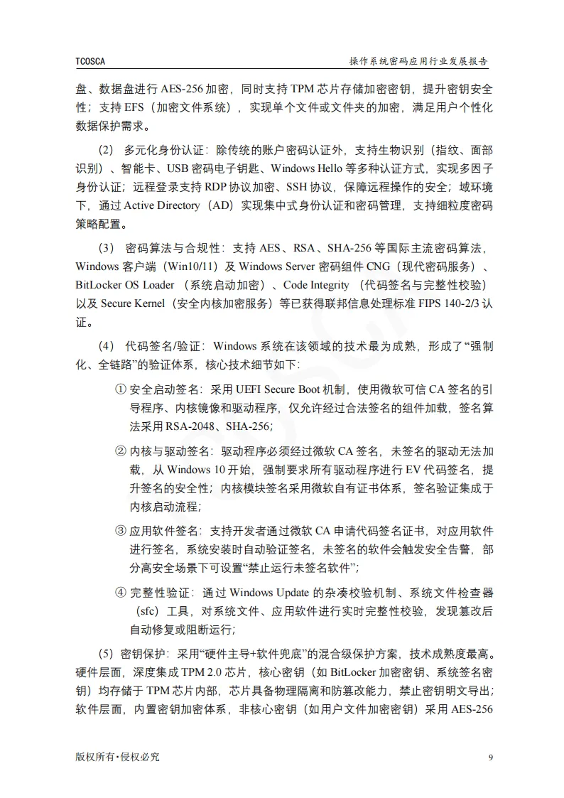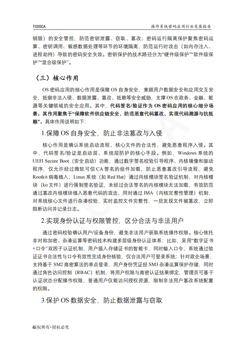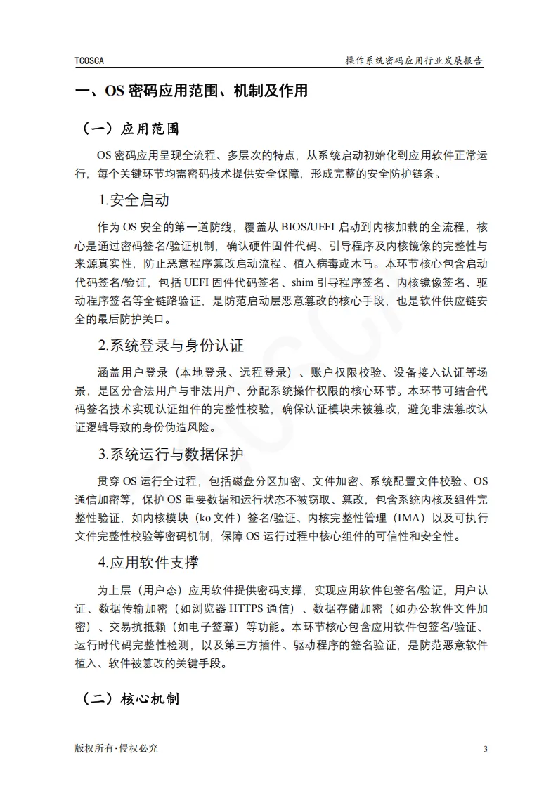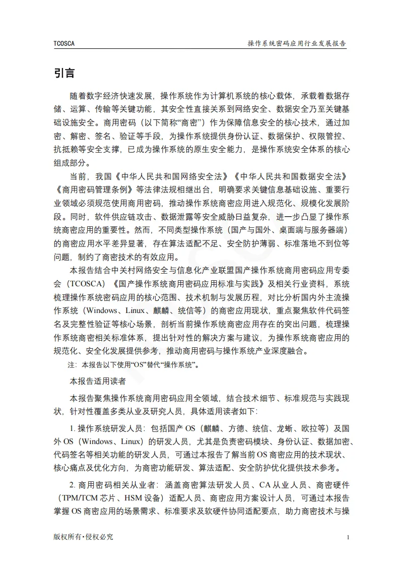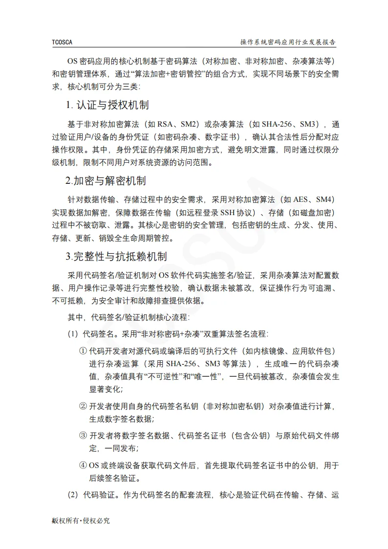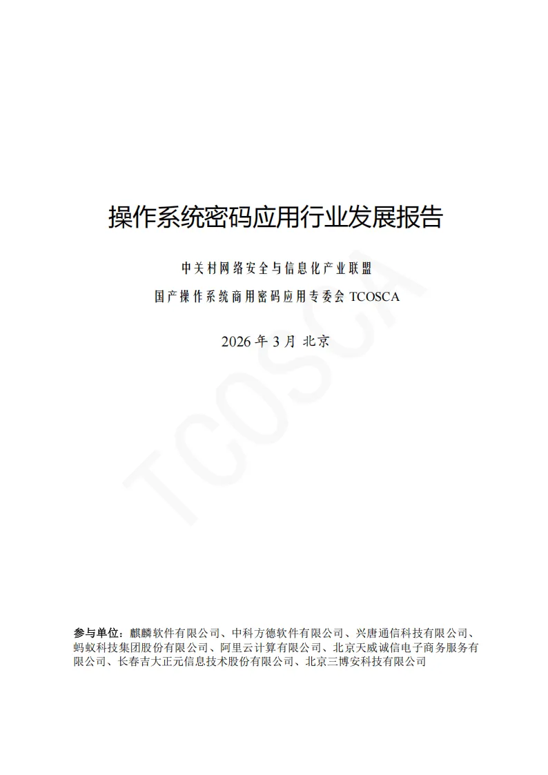 《2026操作系统密码应用行业发展报告》由中关村网络安全与信息化产业联盟相关专委会编制,系统梳理了操作系统(OS)商用密码应用的发展现状、核心问题,研判发展趋势并提出解决方案。报告指出,商用密码是操作系统安全体系的核心组成,为系统提供身份认证、数据保护等原生安全能力,其应用已进入规范化、规模化发展阶段,且覆盖系统安全启动、身份认证、数据保护、应用软件支撑等全流程环节,依托认证授权、加解密、完整性验证等核心机制实现安全防护。