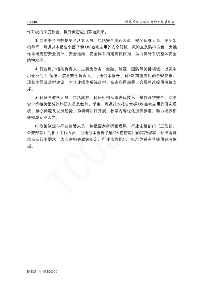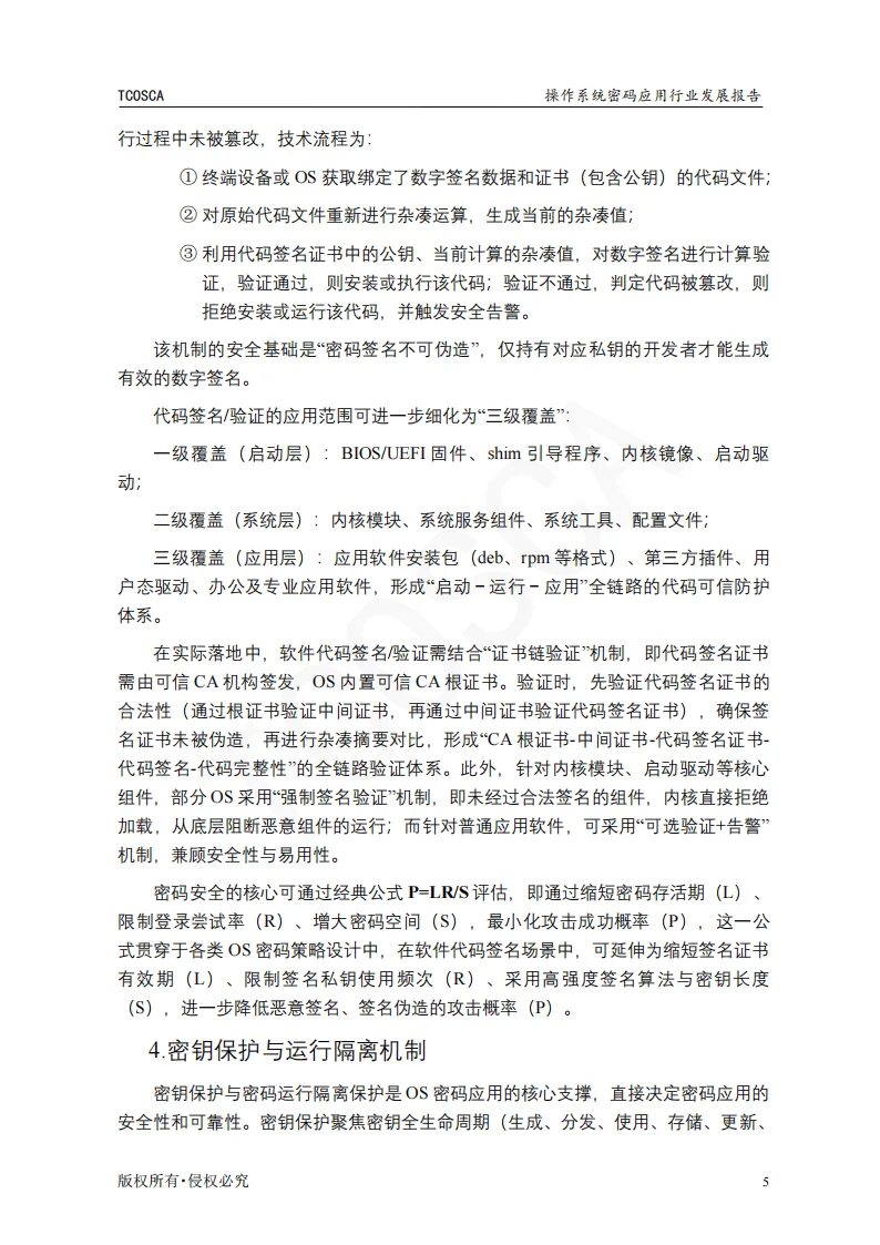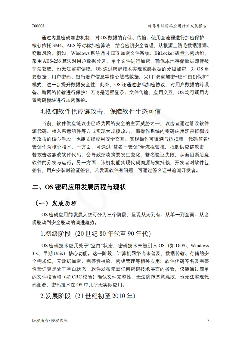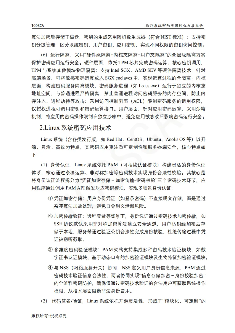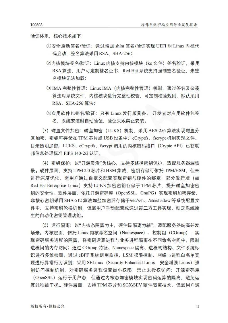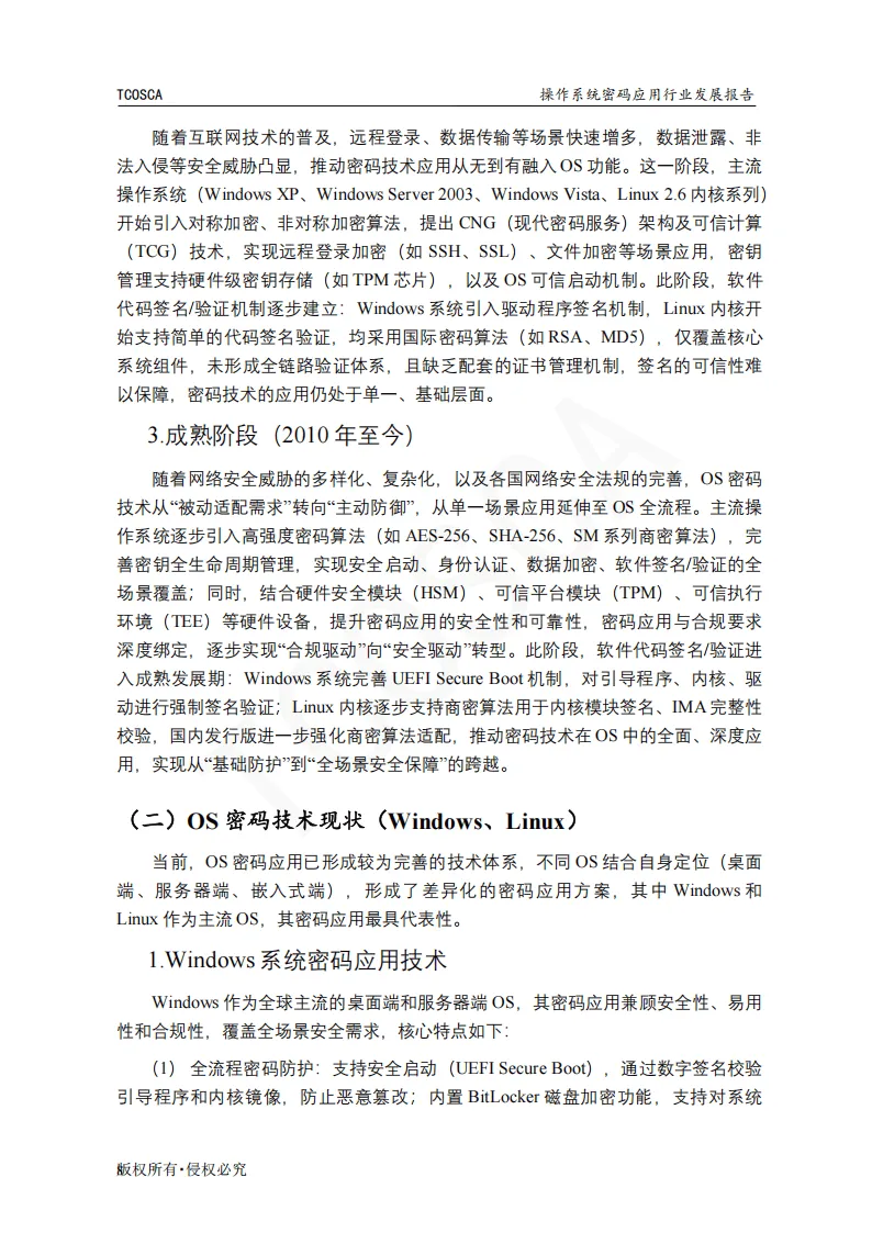 《2026操作系统密码应用行业发展报告》由中关村网络安全与信息化产业联盟相关专委会编制,系统梳理了操作系统(OS)商用密码应用的发展现状、核心问题,研判发展趋势并提出解决方案。报告指出,商用密码是操作系统安全体系的核心组成,为系统提供身份认证、数据保护等原生安全能力,其应用已进入规范化、规模化发展阶段,且覆盖系统安全启动、身份认证、数据保护、应用软件支撑等全流程环节,依托认证授权、加解密、完整性验证等核心机制实现安全防护。