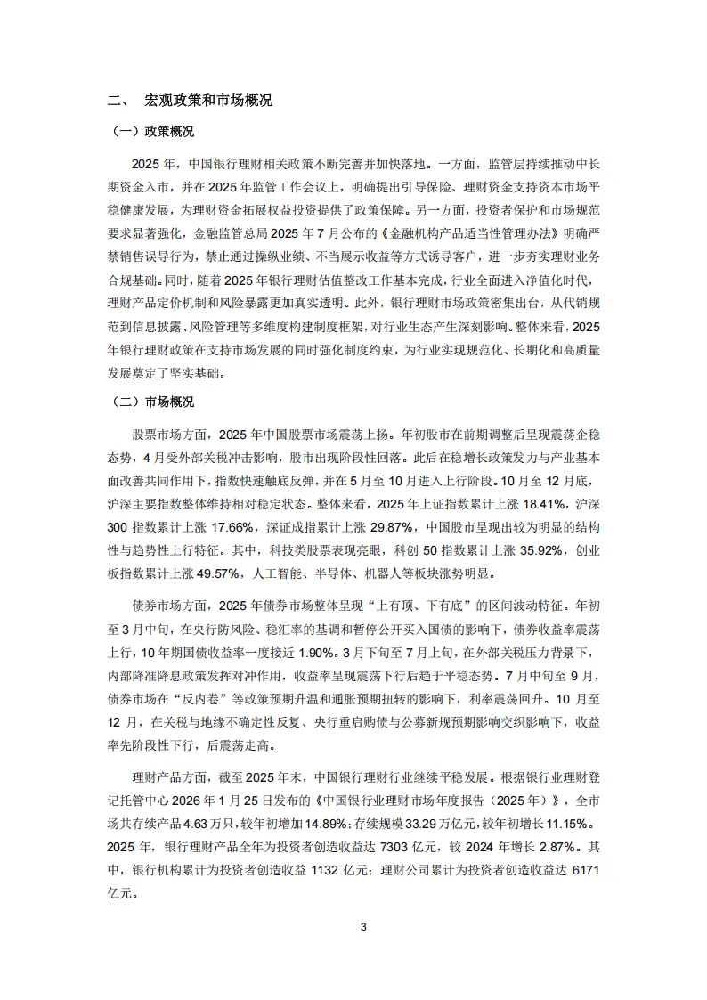 2025年中国银行理财行业在政策完善与市场回暖的双重推动下,迈向规范化、长期化和高质量发展,年末市场存续规模达33.29万亿元,较年初增长11.15%,全年为投资者创造收益7303亿元,同比增长2.87%。政策层面,监管持续引导中长期资金入市,强化投资者保护,估值整改完成后行业全面进入净值化时代,代销、信息披露等制度框架不断完善。市场层面,股市震荡上扬呈现结构性行情,债券市场区间波动,理财资金持续流入权益市场,固收+、混合类等含权产品发行规模显著增长。