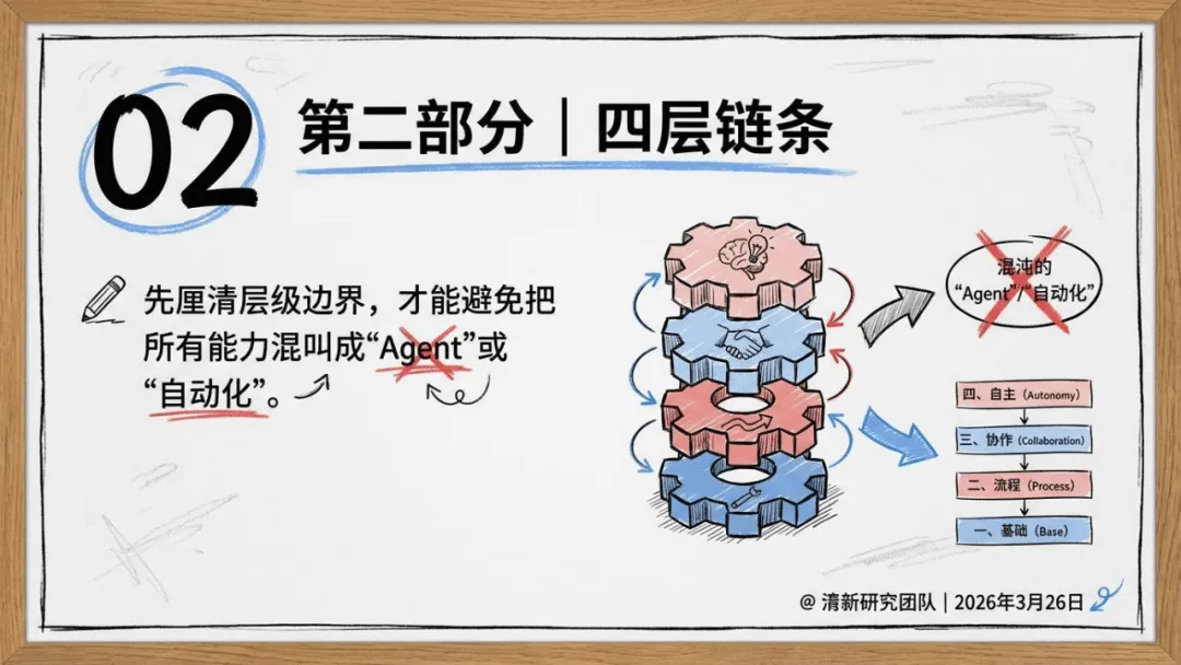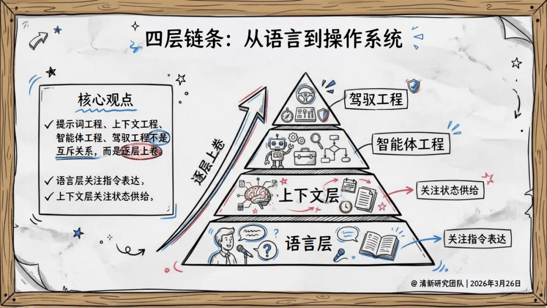 报告梳理了四层工程体系的核心边界:提示词工程解决“怎么说清楚”,适用于短时闭环单轮任务,如今正向可执行契约演化;上下文工程作为隐形内核,负责“喂给模型什么”,需解决上下文有限、信息腐烂等问题,保障状态高效供给;智能体工程聚焦让模型动起来,区分预定义的工作流与动态决策的智能体,是一套包含模型、工具、评测等的系统工程;驾驭工程则是系统级的制度层设计,吸纳前三者并解决其覆盖之外的系统运行问题,被定义为围绕高自治AI构建的可持续执行环境。