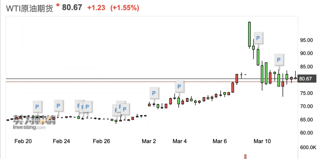 3月9日,WTI主力合约最高报119.48美元/桶,布伦特原油主力合约一度触及119.5美元/桶,创下阶段性高点。
