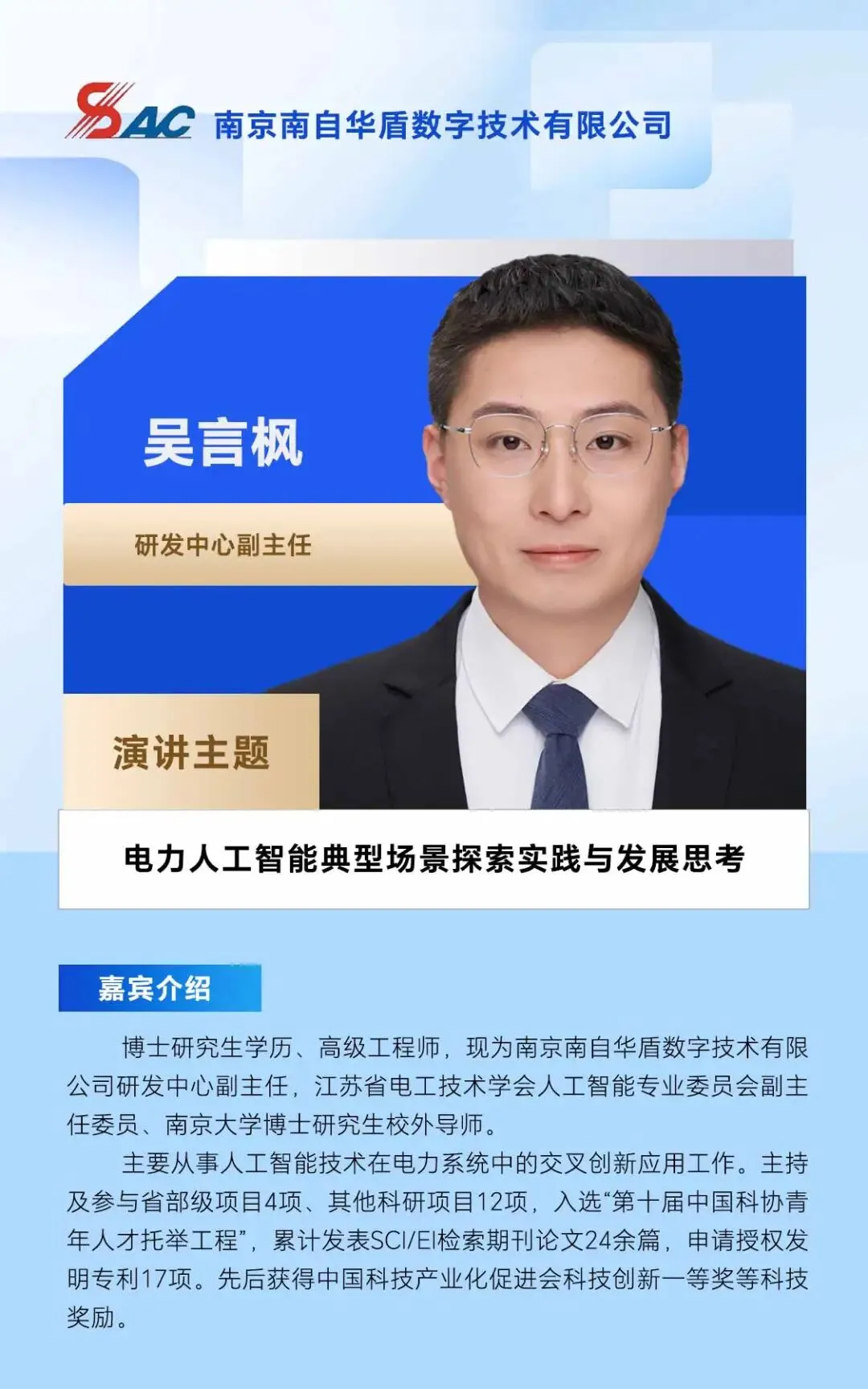 6月23-25日,2026中国电力企业数智化大会将在杭州启幕,大会特邀南京南自华盾数字技术有限公司研发中心副主任吴言枫先生发表演讲《电力人工智能典型场景探索实践与发展思考》。
