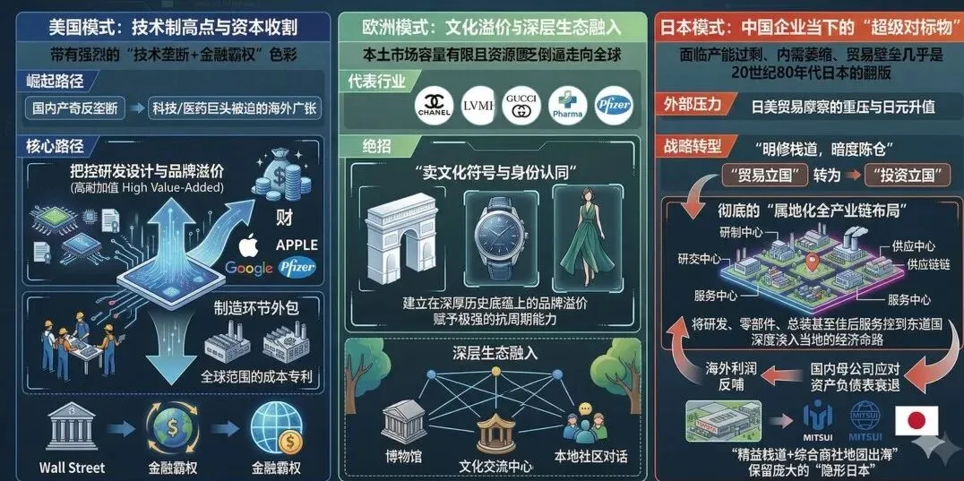 欧洲模式:文化溢价与深层生态融入。 欧洲本土市场容量有限且资源匮乏,这倒逼欧洲企业(如家电、医药、奢侈品)必须走向全球 。欧洲企业出海的绝招是“卖文化符号与身份认同”,这种建立在深厚历史底蕴上的品牌溢价,赋予了其极强的抗周期能力 。