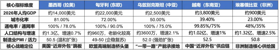 制造业出海的核心诉求是寻找劳动力成本洼地、规避贸易壁垒,并具备基本的基础设施支撑能力。