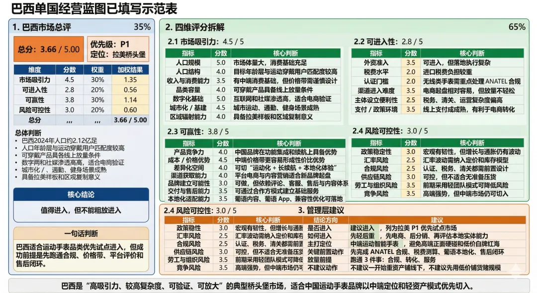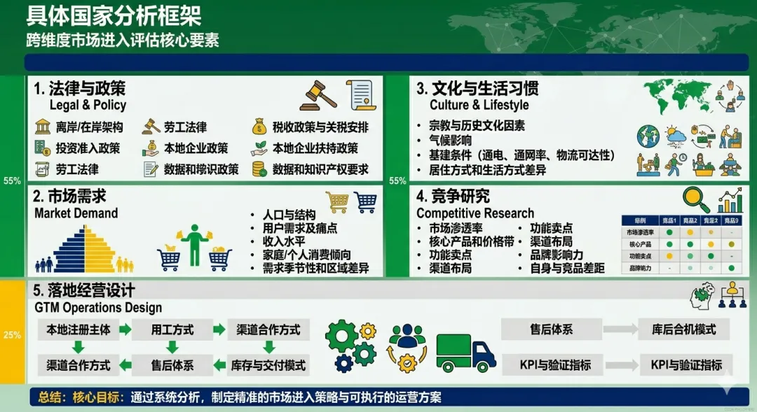 重点维度:国家需求特征、产品适配性、价格带匹配、渠道可触达性、品牌认知门槛、售后和交付要求
