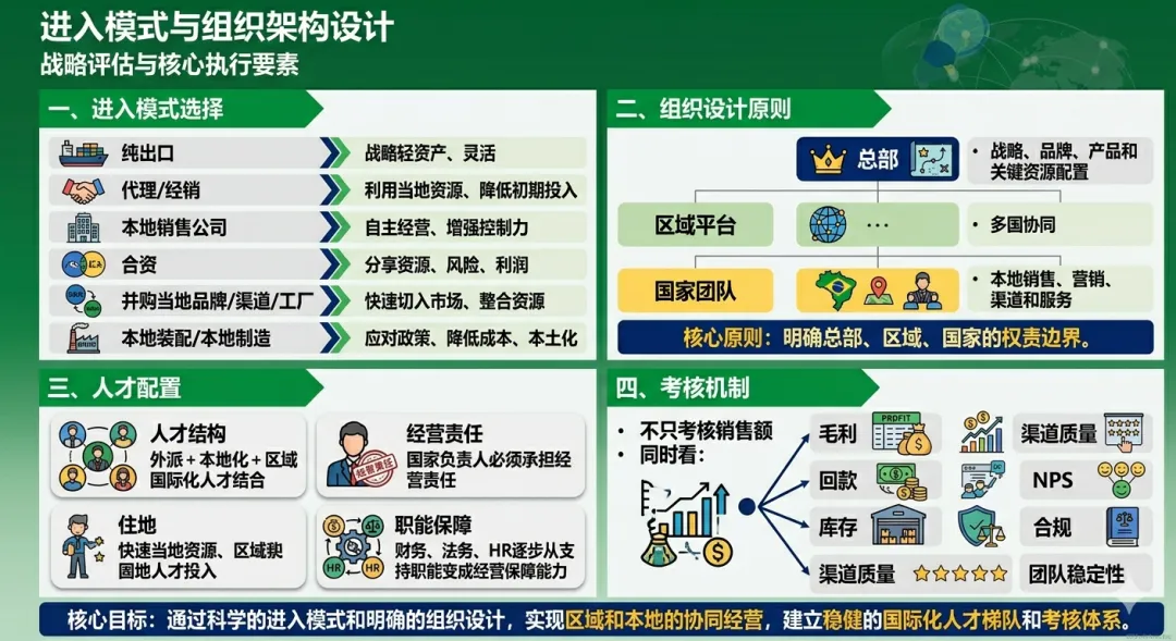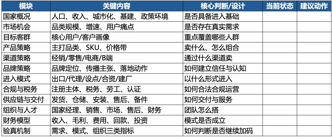 字段:目标国家、核心品类、进入模式、组织配置、合规架构、渠道模式、KPI