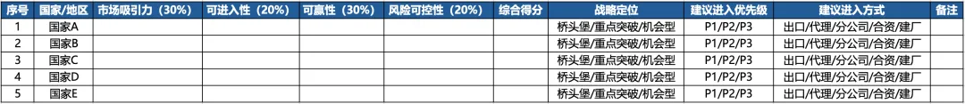 字段:国家名称、市场吸引力评分、可进入性评分、可赢性评分、风险可控性评分、总分、建议动作