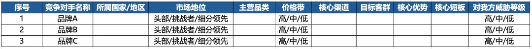 字段:竞争对手名称、市场份额、产品组合、价格带、渠道覆盖、品牌认知、优势、弱点、我方切入点