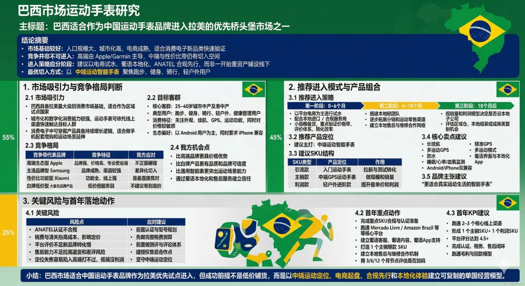 说明:以下是案例是我帮一个深圳好朋友做的具体案例。朋友是跨境出口做运动手表的,我们一起沟通之后,最终决定去巴西市场,以下的案例就是以我给他做的具体分析来拆解给大家一个参考的框架,给有需求的商家具体参考分析思路和具体参考的分析框架。(注:每个商家有自己的特性和差异,不能照搬里面的所有内容,需要根据自己的实际情况进行调整优化,仅供参考。)