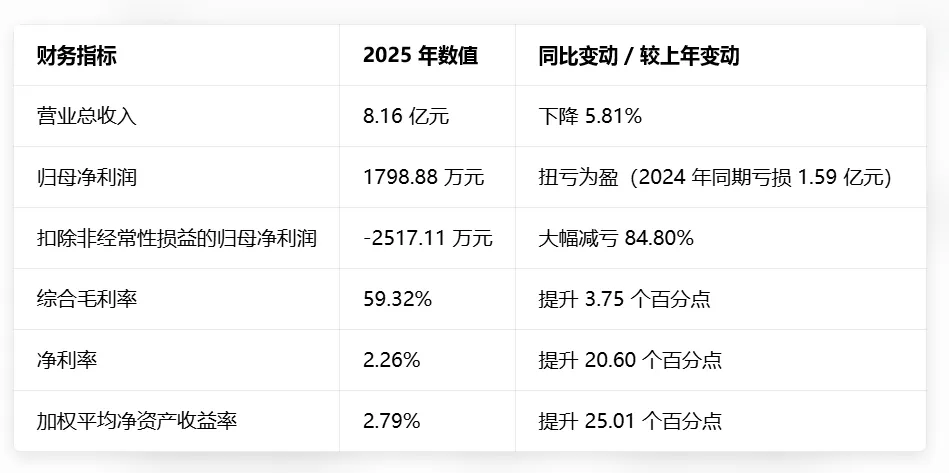 全年实现营业总收入8.16亿元,同比下降5.81%;归母净利润1798.88万元,同比实现扭亏为盈(2024年同期亏损1.59亿元);扣除非经常性损益的归母净利润**-2517.11万元**,同比大幅减亏84.80%;全年综合毛利率59.32%,同比提升3.75个百分点;净利率2.26%,较上年同期提升20.60个百分点;
