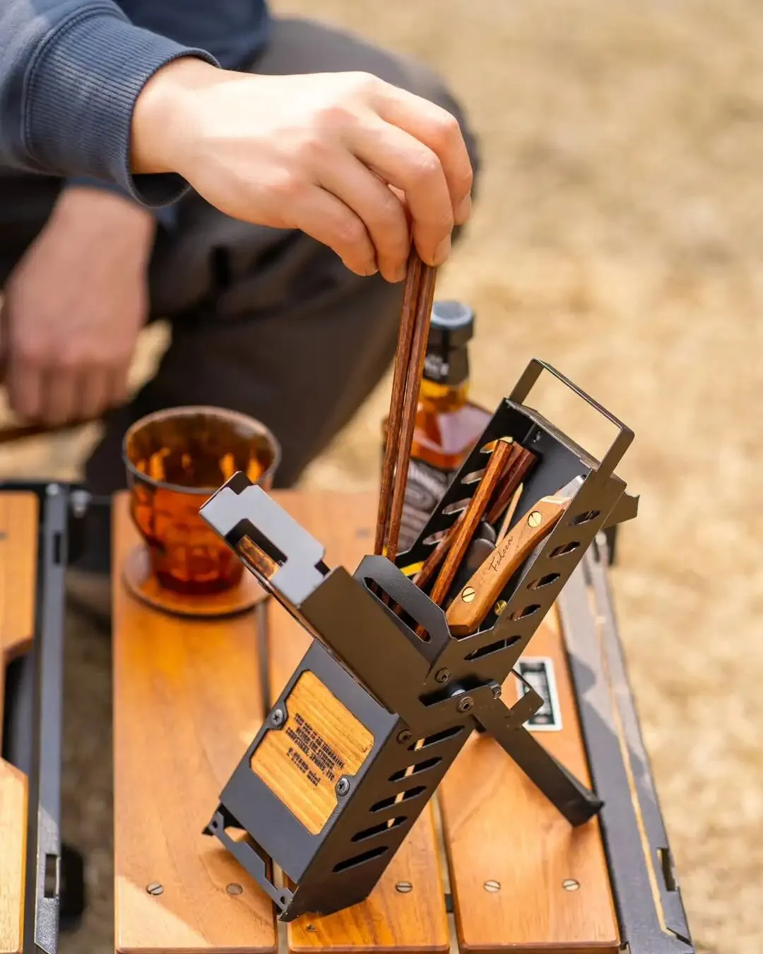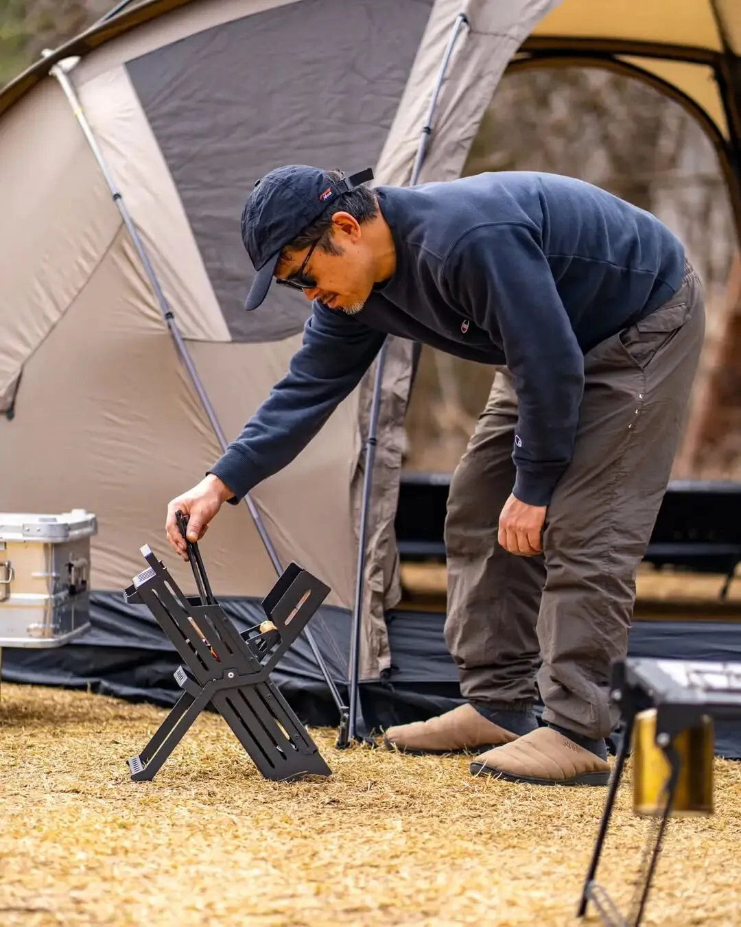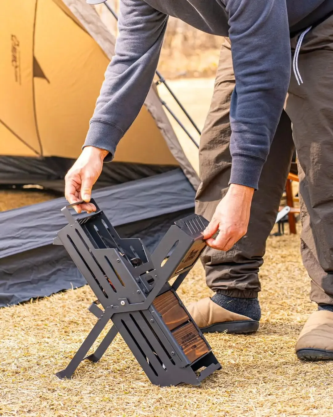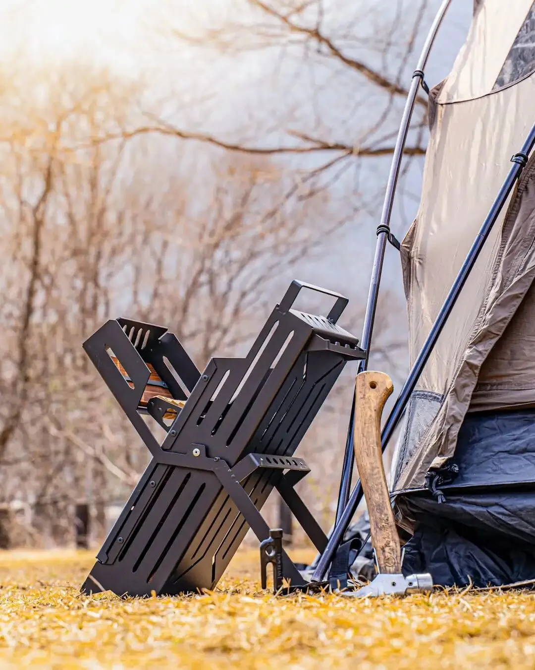 X-STAND 将“弯腰-拿钉-直立-敲击”的繁琐过程,简化为顺畅的连贯动作。而同步推出的 mini 版本,则为单人露营或轻量化玩家提供了更紧凑的选择。这不仅是一件收纳器物,更是将人体工学引入营地劳作的实用方案。