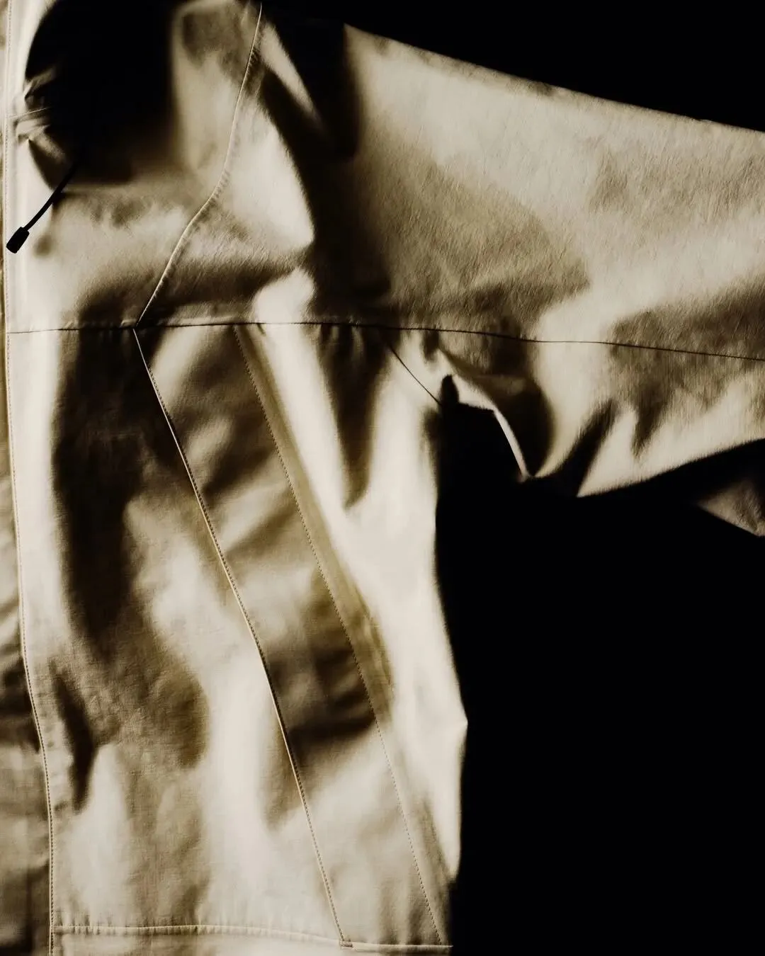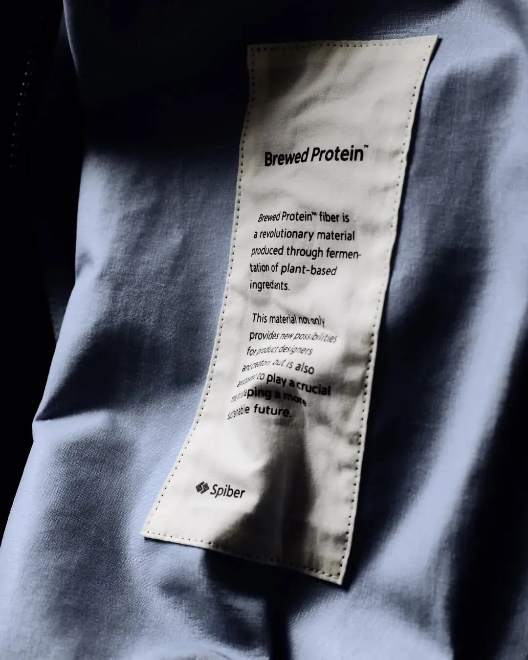 本次合作的核心在于 Spiber 研发的 Brewed Protein(酿造蛋白) 纤维。这种新型材料摒弃了传统的石油基合成路径,转而采用植物衍生糖发酵工艺制成。系列中包含 Brewed Protein 3L Jacket 与 Brewed Protein Act Field Jacket 两款单品,均采用了经典的三层(3L)复合结构,在确保防风、防水等基础户外防护性能的同时,赋予了面料独特的微观质感与环保属性。
