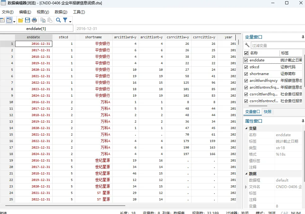 ▪ 数据价值:CNDD 企业年报碳信息词频数据集既破解了过往企业碳信息披露研究中量化测度难、维度覆盖不全、长时序连续数据缺失的核心痛点,为双碳目标背景下企业低碳行为的异质性特征与动态变迁规律研究提供了长周期、多维度的微观面板数据支撑,也为环境会计、公司金融、公司治理、环境经济等领域开展碳信息披露的影响因素、经济后果与作用机制等实证研究奠定了核心数据基础,同时可为监管部门完善碳信息披露制度体系、评估政策实施效果提供可靠的经验证据,兼具重要的学术研究价值与现实应用意义。