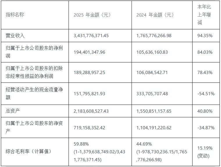 • 公司2025年营业收入达到34.32亿元,同比增长94.35%,几乎实现翻番。这表明公司在报告期内市场拓展和业务增长取得了显著成效。